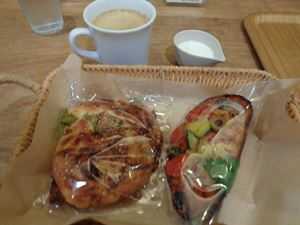 イートインしたねぎみそガレット、塩鯖のタルティーヌ、ホットコーヒー