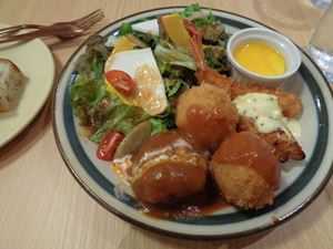 ハンバーグ、ホタテとサーモンのクリームコロッケ、エビフライ、チキン南蛮、サラダ、デザートがワンプレートで運ばれてきました。どれもおいしかったですが、特にハンバーグとクリームコロッケがおいしかったです。