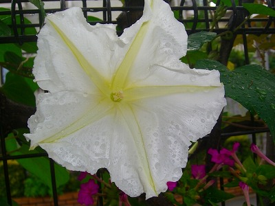 急に涼しくなってきた今日。毎日、ビルが6時半ごろ起こしてくれます。今日も娘はお弁当持ちで部活に出かけました。長男も卒論なのか大学に行きました。昼間はのんびりとワンコは寝ているし、私は、PCの前でお尻に根が生えています。ベランダのバラが、咲いています♪昨日のウインショッテン今日のウインショッテン昨日のERキャスリン・モーリー今日のERのキャスリン・モーリーERなんですが、ついてきたふだの写真と同じお花が見れません。何でかな~?名前のわからないお花、だんだんピンクがかってきました。ご存知のかた、教えて下さいね~昨日の夕顔ですが、正式にはよるがおらしいです。『やかいそう』『しろばな夕顔』とも言われて、普通の夕顔はかんぴょうの材料となる瓜科でもっと小さいそうです。源氏物語の夕顔はこのかんぴょうのほうの夕顔で、あの時代にはこのよるがおはなかったんでしょうね。そういえば、お花は大きくて、すごく甘い香りがして酔ってしまいそうでした。星のしぐれ☆彡さん、いろいろ教えてくださってありがとうございます!