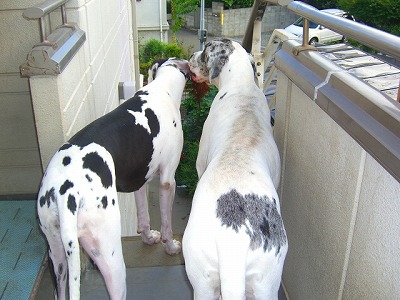 ベランダのバラ、だんだん開いてきたのでまた、写真を撮りました。真っ赤なウインショッテン・・・今回は大きくて、直径10cmぐらいになっていました。フレンチパヒューム・・・色合いがやさしくて、香りも素敵です。ケニギン・ベアトリックス・・・うちでは珍しい色合いです。最近中間色のバラがほしくなっています。予約会も始まっているけど、しばらくまだ様子を見て、考えようと思います。来週17日、月曜から、中国に旅行に行きます。先に土曜から主人が出張で上海に、私は後から、3泊4日の予定です。気がかりは、娘が朝、起きれるかどうか、ワンコたちのこと、お花たちのこと・・・・・携帯がつながるようなので、更新できるかなとは思っているのですが・・・今日は今から、義母のところへ、また月命日がやってまいりました。義父が亡くなって丸3年経ちました。義母も旅行に行ったり、老人大学に講義を聴きに行ったりとやっと積極的にいろんなことをされるようになってきました。ただ、健康面に心配が出てきて、(うちの実家の両親もそうですが)医者がよいが続いています。昨日のグレートデンのビルとピンキー『お布団が片付けられない~~』