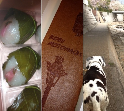 日曜日、午後に大丸で買った甘いもの。たねやさんの桜餅、この間から実家へ行く時も買って持って行きました。今の季節限定!その横は、文明堂のカステラ、神戸大丸限定だそうです。甘いものが欲しくなる・・・・・やっぱり疲れているのかも。右は、都賀川を歩くピンキー、お尻を向けてごめんなさいね。