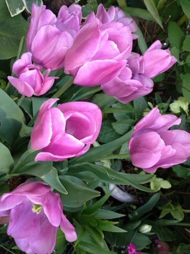 ベランダのチューリップが咲きそろいました。薄紫のチューリップ、かわいいです。また寒くなってきたので、持ちがいいかな?