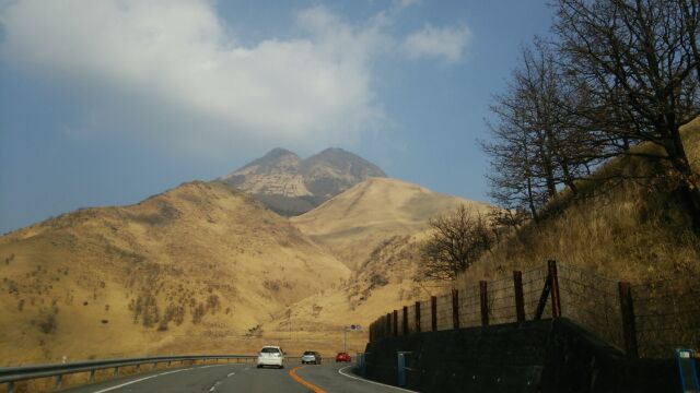 熊本城を後にして、阿蘇山を望めるビューポイントを目指して出発 ミルクロードと言う道路を通って、展望台「大観峰」へ。 今日の熊本は天気が良くて、お昼には10度前後まで気温が上がっていたのですが、さすがに山の上は寒くて((+_+)) 3度か4度くらいだったでしょうか。 風も冷たく感じました。 ガスがかかっていて阿蘇山があまり綺麗に見えなかったのが残念でした 噴火している様子が分かりますでしょうか!? 阿蘇は広大な草原地帯が広がっていて、日本では無いような雰囲気でした。 暖かい時期に来ると、青々と繁った牧草が見れて、また違った景色を楽しめたのでしょうね! 今夜の宿泊は黒川温泉です。 既に温泉にも入り、豪華な夕飯もいただきました。 これからまた温泉に浸かって、ゆっくりと休みたいと思いま~す(^^)
