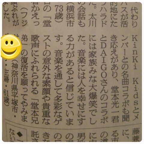 間もなく福岡から大阪に戻ります 今回もやっぱり飛行機が遅れていて 、ただ今ラウンジで待機中 早く我が家に到着したいものです。 今朝は主人の部屋を掃除して、洗濯とアイロン掛けもやって出て来ました。 大きな荷物は宅配便で届けてもらうことに お土産などで一つカバンが増えてしまったので、とても持って帰れそうになかったんですよねー 今回の九州旅行では神社やお城など、階段を登ることが多くて、結構大変でした。 途中からは膝が痛くて 手摺に掴まりながら歩いてました。 神社やお城巡りには健脚であることが求められますね。 普段から足腰を鍛えておかなければ、と思いました。 ストレッチと合わせて、スクワットもしようかな~(^^; 何とか頑張りたいと思います さて、私が九州に行っている間に、光ちゃん関係では大きな動きは無かった…ですよね!? SHOCKの当落確認もまだ始まっていないようで。 ホッとしたと同時に焦る気持ちも もう間もなくと思うとドキドキしますね。 福岡空港のラウンジで朝日新聞を読んでいると、光ちゃんの名前を発見 番組欄に先日の「堂本兄弟SP」についての視聴者の感想が書かれていました。 番組の復活についてはいろいろと意見があると思いますが、光ちゃんとDAIGOくんがAKBと一緒に踊ったダンスについては好評だったようで、単純にそこは嬉しいですよね~(*^^*) 照れながらも全力でキレッキレのダンスを披露してくれた光ちゃんが素敵でした このようなコラボはまたいつか見てみたいですね!