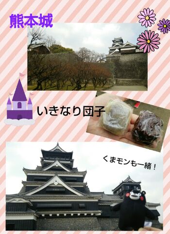一つめのお城・・・熊本城に行ってきました! ミニくまモンも一緒に(^^; 加藤清正が築城し、その後は細川家が城主であったことは有名ですね。 姫路城、名古屋城と合わせて日本三名城と呼ばれているとか。 別名を銀杏城と言うそうです。 確かに城内には銀杏が落ちていました 今の天守閣は昭和35年に再建されたものだとか。 歩いて上りましたが、見晴らしが良かったです! 売店で熊本名物の“いきなり団子”を購入。 小麦粉を練った皮でさつま芋と餡をくるんで蒸したお菓子です。 素朴な感じで、中のさつま芋が美味しかったです お昼ご飯は熊本城近くのラーメン屋「桂花」へ。 くまもとラーメンを食べました。 濃厚なスープと固い麺が特徴で、とても美味しかったです。 この後は阿蘇方面から黒川温泉に向かいます。