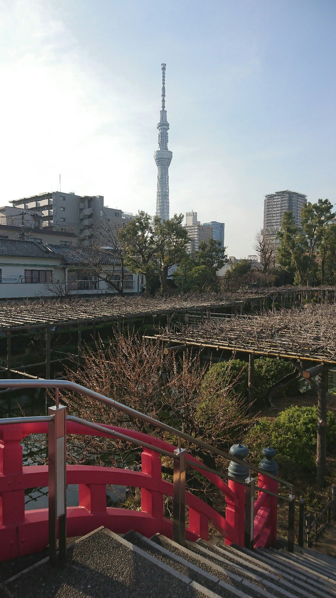 今回の東京遠征では、スカイツリーに近いところをウロウロとしていました。 まずは、20日(水)のSHOCK観劇前に「亀戸天神社」へ。 本殿もなかなか立派でした。 天神さんなので、学問の神様ですが、SHOCKの無事終演をお願いしておきましたf(^^; こちらは藤で有名なようで、五月頃には綺麗な藤の花が見られるそうです。 そして、21日(木)には朝から「向島百花園」へ。 「都立文化財9庭園」の内の一つです。 六義園と旧古河庭園には行ったことがあるので、これで3園目です。 ここは一年を通して様々な花が楽しめるようですが、今の時期は梅と桜の端境期⁉ ちょっと寂しい感じもしましたが、きちんと手入れをされたお庭でした。 こちらでもスカイツリーをバックにパシャリ(^_-) お天気が良くて、池の水がもう少し綺麗であれば、尚良かったんですけどね(^_^;) それでも、様々な地点からスカイツリーが見れて、テンションが上がり気味の旅行となりました\(^^)/