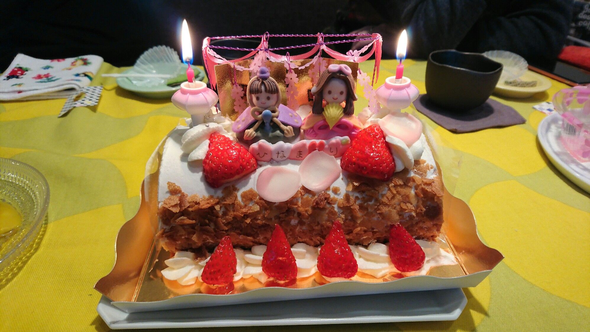 今日は中学時代の友人宅へ。 バレー部に所属していたメンバー五人での鍋パーティーに参加して来ました。 3月3日ですから“ひな祭りパーティー”。 と言っても、今日集まったのはただの偶然ですけどねf(^^; 私はデザート担当だったので、姫路からの帰り道に梅田で購入。 一応、ひな祭り用のケーキにしてみました。 ちょっと分かりにくいですが、ぼんぼりや金の屏風、そしてお内裏様とお雛様がロールケーキの上に乗っています。 前菜やお鍋を食べて満腹だったのですが、デザートは別腹( v^-゜) ペロリと平らげました。 2時から始まって8時まで(^^; 約6時間に渡って食べたり飲んだり・・・。 楽しい話もいっぱいできて、お腹も心も満たされた一日でした(^^)v