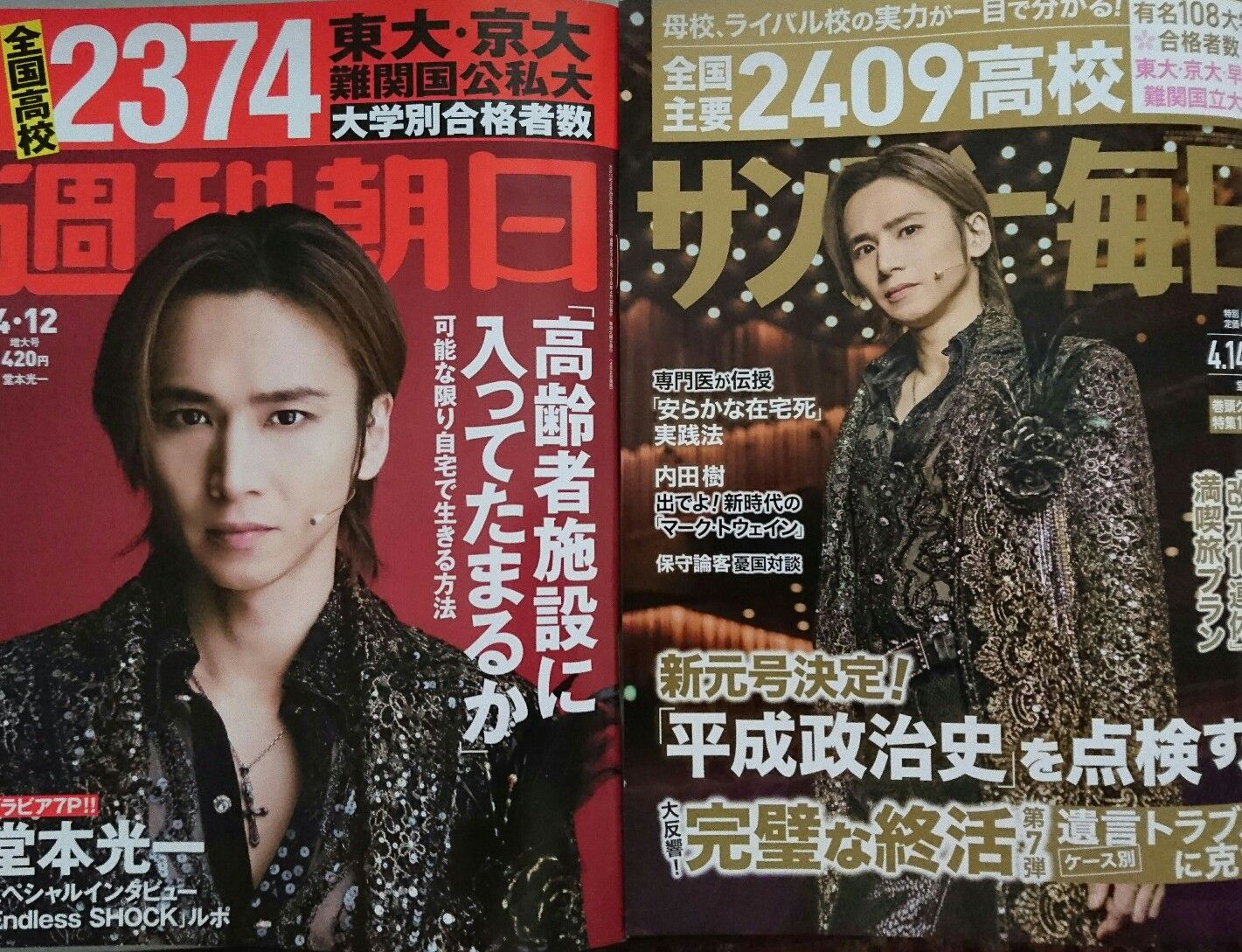 本日発売の「週刊朝日」と「サンデー毎日」を購入して来ました 夕方、地元の書店でゲットしたのですが、残り部数が少なくなっていました 無事に買えてホッ(^_^;) どちらもSHOCKの公演終わりでしょうか・・・素敵な座長が表紙を飾っています。 特に「週刊朝日」の真っすぐな眼差しにドキッ グラビアも素敵な写真が沢山掲載されています。 「Higher」の着替え途中の背中も大好物 ステージフォトとして発売して欲しいくらいです インタビューでは“「人に任せる」ことの大切さ”について語られていて。 読み応えのある誌面でした。 「サンデー毎日」も象徴的なシーンの決めポーズの写真がふんだんに掲載されていて。 終わったばかりのSHOCKの世界に再び引き込まれるような気分になりました。 こちらのテキストは“僕が舞台に立ち続ける理由”と言うテーマ。 謙虚で、負けず嫌いで、ドSな光ちゃんの素顔が垣間見えるようなインタビュー記事です。 読んでいて、“ああ、やっぱりこの人の考え方が好きだなぁ”と・・・。 そう思えた二つの雑誌でした