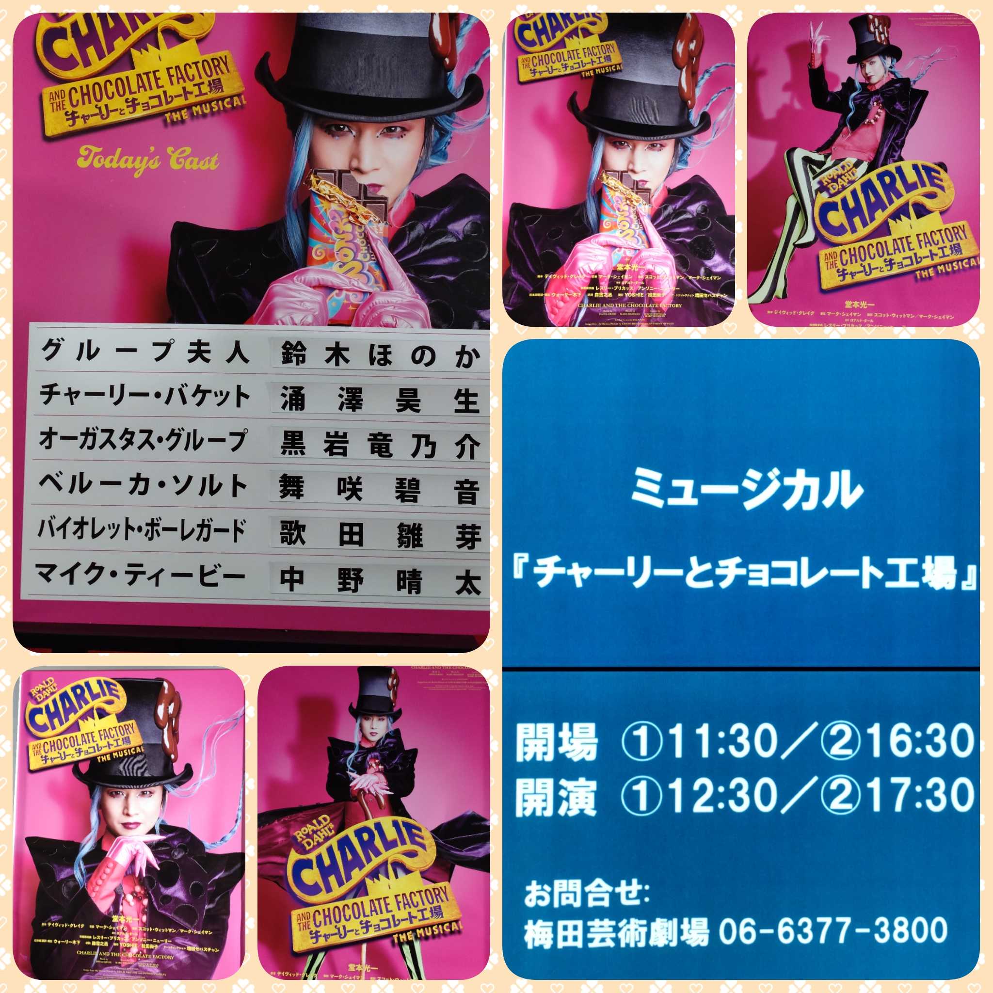 昨夜は「チャーリーとチョコレート工場」の初日公演の幕が無事に降りたようですね(^^)vカテコではチャーリー役のチョウ シくんと光ちゃんからご挨拶があったとか。88年頃に旧フェスティバルホールで先輩の舞台を観たことがある、というような話をしていたみたいですね(◠‿◕)フェスティバルホールは初めての会場かと思っていましたが、そうでは無かったんですね。インスタには梅芸前で撮った写真もアップしてくれて。チャリチョコの会場はフェスティバルホールだと注意喚起を^^;間違えてしまってもそう遠くは無いので、リカバリーできるとは思います。歩くと30分程、電車利用で20分ちょっと、タクシーなら10分も掛からない距離です。何にしても、余裕を持って会場入りできるようにしておきたいですね(^_-)昨日の公演ではキャンディマンが客席に降りた、という投稿も見かけました。演出としてそうしたのか、光ちゃんのアドリブなのか・・・。今日以降の公演に注目ですね(θ‿θ)カテコでは大阪公演のスケジュールのハードさも訴えていたという光ちゃん(;´∀`)休演日がないんですものねー(;^ω^)しっかりと体のケアをしながら、大千穐楽まで走り抜けていただきたいと思いまーす。今日は早速、マチソワ2公演!キャストの皆さんにとってはハードな1日になりそうですね。観客の皆さんの大きな拍手が力になるんでしょうね〜(*゚▽゚ノノ゙☆パチパチ今日も素敵な工場見学の空間となりますように(。•̀ᴗ-)✧