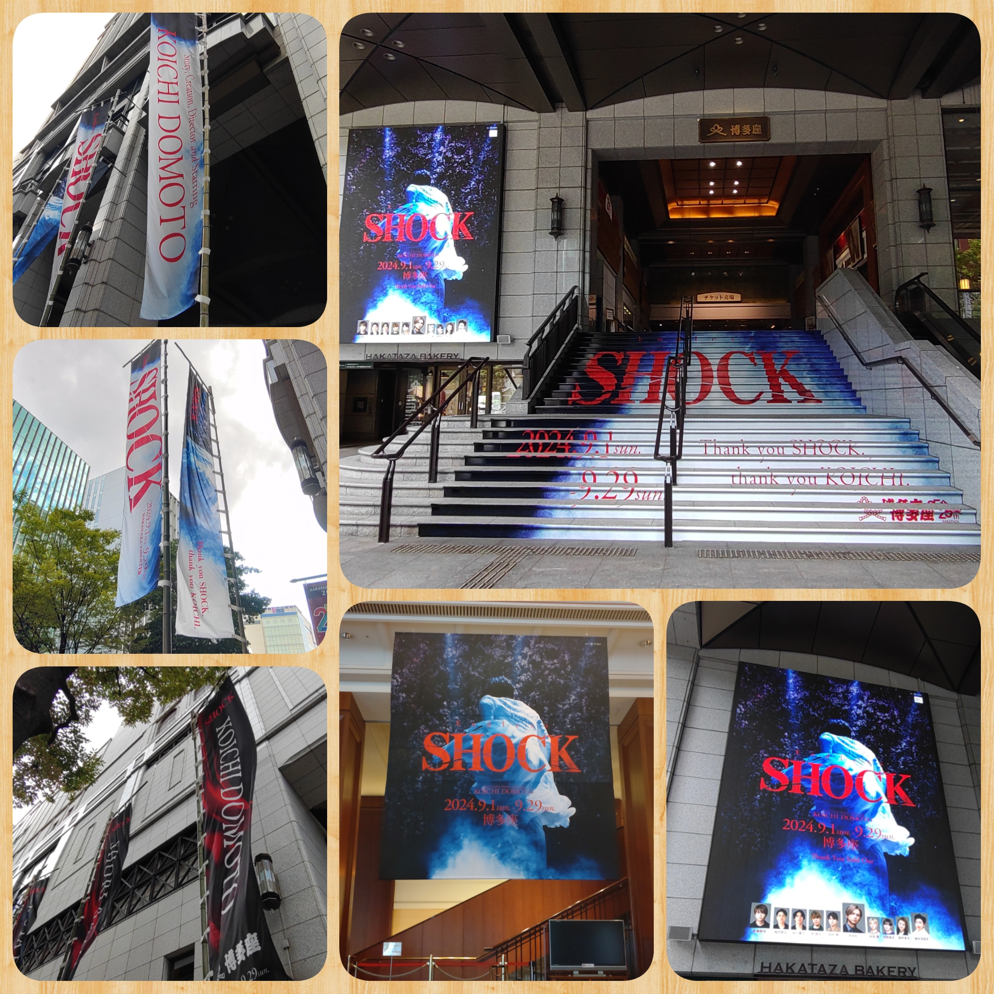 ようやく私のSHOCK観劇日がやってきました(*´ω`*)今夜の公演を観劇します。ここ数日、腰痛に悩まされたり、夫がアレに感染したりΣ(´∀`;)どうなることかと思いましたが、無事に博多座に来ることができました(^^)vまずは看板と幟にご挨拶(^_-)風があって、幟は上手く撮れませんでしたが^^; 福岡は良いお天気で(◔‿◔)午前中に着いて、幾らか観光をしてきたのですが結構暑かったー(;´∀`)思った以上に体力を奪われてしまいました(;´д`)少し休んで再び博多座へと向かいたいと思います。客席から目一杯の拍手を送ってきま〜す(*゚▽゚ノノ゙☆パチパチ