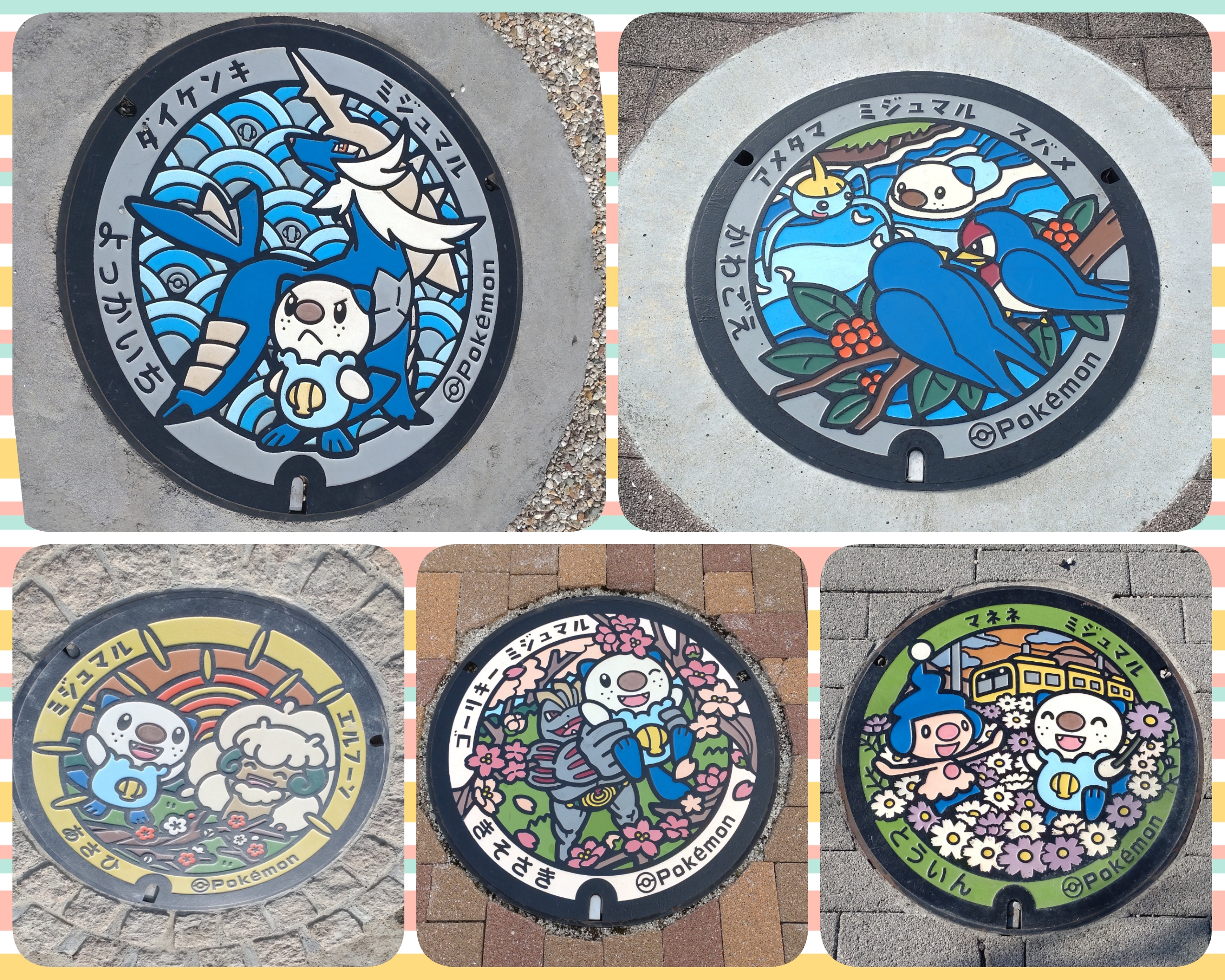 先週土曜日に「なばなの里」を訪れる前に三重県内でポケモンマンホールの写真を4枚ゲット(^^)v三重県には全部で22箇所あるそうですが、鹿児島県などと違って設置されている市町村が全部バラバラで^^;ちょっと大変でしたが、とりあえずは「なばなの里」からそう遠くない場所を巡りました。途中、ポケフタ仲間にも遭遇(^_-)お勧めの場所などの情報交換もしたりして楽しいひとときでした(◔‿◔)三重県のポケモンはミジュマル。“三重“が“みじゅう”と読めることからだそう。翌日にも1箇所訪問して、全部で5つ撮影できました。帰りには滋賀県にも寄ることにした私たち(*ノω・*)甲賀市で3箇所、大津市で2箇所の計5箇所で撮影に成功。全部で10個のポケフタをゲットできました〜(*´ω`*)因みに甲賀市はしのびポケモンであるゲッコウガ、大津市は水・飛行タイプのギャラドスがメインとなっていました。これで通算56個を獲得したことに(^^)v今年中に50個を目指そうと思っていたのですが、上方修正して60個を目標にしようかな〜(^_-)