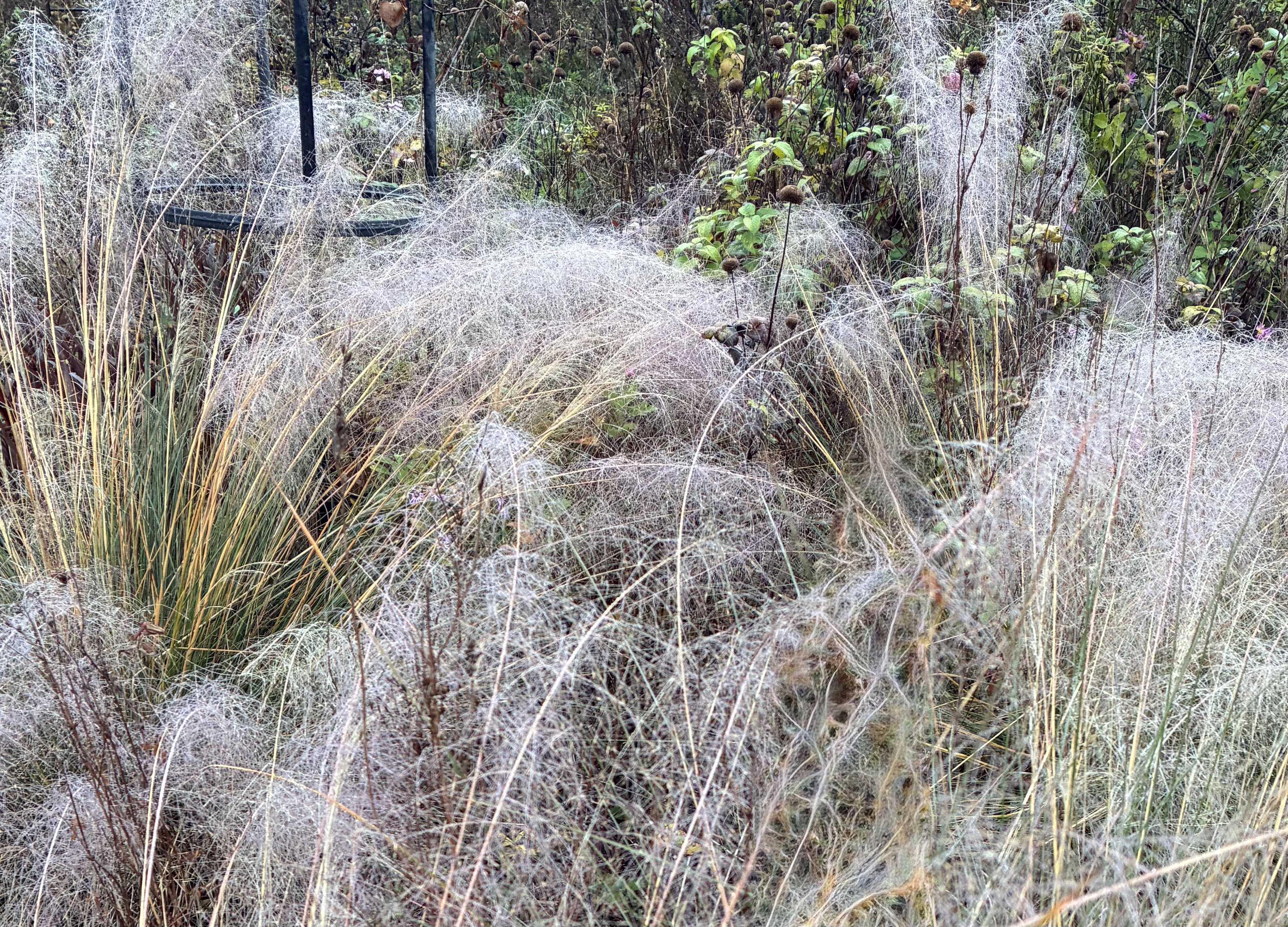 ↓ミューレンベルギア カピラリス秋のピンクの花穂もきれいだけど今時分の朝露に光る枯れ…