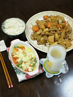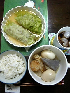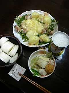 きゃあ~、じゅんのの金髪でアップよ~。素敵~!!でも、衣装が地味過ぎない?あやや笑い過ぎ!!アナウンサーの自宅公開の時の、上の小窓に映るじゅんのの美しい事!!NHKって、カンペないなんてびっくり!!少クラはカンペあるけど、アナウンサーじゃないからかな~。じゃあNHKのスタッフさん、慣れてなくて大変なのかもね?それに、30秒、何も見ないでピッタリインタビュー出来るって素晴らしいですね。プロって凄いですね!!じゅんの、やたらと姿勢がいいわ~。あ~とうとうじゅんののビリヤード姿が見れるのよ~!!ドキドキ。きゃあ~、じゅんのの自宅よ~!!クローゼットよ~。やっぱりピッチリしているわ~。それにしてももの凄い服の数だわ~。自分のポスターがちゃんとフレームに入っているわ~。前にカツメンの誰かが言ってたものね。自分のポスターが部屋にあるって。本当にあったんだわ~。ビリヤード場では、やっぱりすっぴんなのね。あたりまえかな。ぎゃ~、カッコイイ!!玉がちゃんと入って喜んでいる姿は可愛い~。今B級なんだ。二年半でB級が凄いかどうかはわからないけど。先週、先々週お店のハウストーナメントで優勝ですって!!凄い!!!オイルトリートメントにハマってるなんて。えええええ?私がやってあげたいな~。くぅ~。じゅんのの体を触っている女性、羨ましすぎ~!!高畑さんじゃないけど、その人、どんな気持ちでやっているのかしら?その人幸せなんだろうな~。あ~想像するだけでヨダレが・・・。じゅんの自転車にもハマっているんだ~。段差で転びそうになったなんて、気をつけてよね~。わらび餅食べる時に気がついたけど、また違うネックレスしてますね~。B型は好き嫌いがはっきりしているんだ~。宮本さん、じゅんのに話を振ってくれてありがとう。笑顔が可愛い~。3年前は喧嘩が多かったんだ。舞台でずっと一緒だったら喧嘩してもしかたないかな?でも、今は口喧嘩もないって、大人になったのね~。佐藤アツヒロ、光一、ニッキ、かっちゃんと一緒にゲームやってるんだ。例のミンゴル?知らないでずっとタメ口でやってたら、ニッキだったなんてビックリしちゃうだろうな~。あら?もう終わり?えええええ?もっとやってよ~。じゅんのが出なくなってしまったら一気に眠くなってしまいました。その後しばらく気を失ってました。(笑)いよいよ有閑倶楽部の製作発表があるようですね。月曜日のズームインでやるなら今日か明日かしら?早く見たいです。金曜日は仕事の帰りにお友達の教えて頂いた目黒によってロートのポスターを撮影してきました~。どれも雑誌では見てたけど、あんなに大きいのを見ると興奮しますね~。でも、ちょっと人通りが多くて、撮るのに勇気がいりました。天使のポスター欲しいわ~。最後に先週の食事です。10/9 火曜日、豚肉キャベツロールとおでん豚肉キャベツロールは前に日に仕込んでおいたので、おいしく出来ました。10/10 水曜日はエキストラに行って疲れてたので、きのこパスタだけ作って、一品主人にお惣菜を買って来てもらいました。10/11 お昼にママン(マクロビデオテック)のお弁当を頂きました。10/11 木曜日、鶏肉とさやいんげんの粒マスタード炒めと豆腐ときのこのドリア10/12 金曜日は、有休を取ってた主人が、餅入り鶏つくね鍋あっさり醤油味とほっけの塩焼きと作ってくれました。先ほど主人が競馬をすると言う事で交代しましたが、一度は10万も勝って、最終的には8万円勝ったと言う事でちょこっとお小遣いをもらえる事になって嬉しかったです。これから、有閑倶楽部の番宣が始まりま~す!!見た事ないシーンがさっき見れて嬉しい~。楽しみです。きゃあ~、始まりました!!!ではまた。