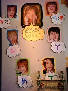 こんばんわ。やっとPCを使えます。まだ更新してないの?とメールを頂き、急がねば!と頑張りました。 昨日は本当に充実していた一日でした。朝、ジャニショに9時過ぎに到着した時はもうたくさんの人が並んでましたが、10時頃には中へ入れました。もう、KAT-TUNの写真売り場は凄い人です。あれ、もう少したくさんの人が見えるように工夫してくれないかしら?っていつも思います。前の人がどいてくれないかぎり、半分から下の方が見えなくて記入出来ません。あ~でもいろんなお友達から先に何枚か見せて頂いてましたが、本当にじゅんの良い写真が多かったわ~。全員 1枚 混合 7枚 じゅんの 27枚 仁君 1枚 たっちゃん 2枚 涼ちゃん 2枚 を買いました。う~ん抑えようと思ったのに、やっぱり買ってしまったな~。ジャニショを出た所で、お友達の仁君ファンのお友達と会いまして、一緒に渋谷にニッポン放送タイムテーブルを探しに数件レコード屋さんに行ったのですが見つかりませんでした。残念。やっぱりニッポン放送さんに送って頂くしかないですね。その後4人でお茶をしながら、素敵な物を頂いたり、楽しいおしゃべりをしてからいよいよじゅんののお誕生日のパーティ会場へ行きました。昨日は、SPさんとまいまいちゃん主催でパーティが行われたのですが、お店は瓦ダイニングと言う所で、お皿が瓦の形で重かったのが驚きでした。今回は全部で37名の方が集まったという事でした。あ~こんなにじゅんのファンがいるって素敵!!(その考え方おかしい?笑)ドームコン以来久しぶりに会うお友達が何人もいて嬉しかったな~。初めてお会いする方もたくさんいたのですが、同じじゅんのファンと言う事で、すぐに盛り上がれるっていいですね~。SPさん、まいまいちゃんをはじめ、スタッフの方がいろいろお店を飾りつけしてて下さってて素晴らしかったです。壁にはこんなふうにディスプレイされておりました。素敵でしょう~?その横にはプラスXのポスターも貼ってあったり、コロガリータのタペストリーが飾られてました。そうそう受付をする時に、誰のファンか、そして名前がわかるようにシールが作られてて、私はもちろんじゅんのシールにgotoroと書いて胸の所に貼ってたのですが、これ、そのお店でも一度なくなったのに、二次会に行く時にコートの隅についているのを発見。そして、二次会のカラオケBOXに到着して、コートを脱いだらまたなくなってしまったのですが、自宅に帰ってふっとコートの裾のほうを見たらちゃんと着いててびっくり!これどうしても記念に取っておきたかったから本当に嬉しかったです。シールちゃん、ありがとうね。さて、話を元に戻しますが、SPさんが作られたスライドショーも見た事ない幼少の頃写真などあったり、じゅんのの歴史を見れる内容で皆興奮して見てました。その後ビンゴ大会があったのですが、始めるときに「もしかして今日誕生日だし、一番に当たってしまうかも?」なんて心で思ってたら、本当に一番にビンゴになってしまってビックリしました!!そして、コロガリータのタペストリーを頂きました~!!ありがとうございます!!お料理も美味しかった~!!ここでもいろんな方ともお友達になれて、またまたたくさんじゅんのファンのお友達が出来て嬉しかった~。あ~もっとゆっくり話したかったな~。本当は一次会で帰る予定でしたが、二次会に行っても夕飯に間に合いそうだったので、参加して来ました。二次会には25名の方が参加しました。ギュウギュウ詰めでしたが、ここでは少クラ映像を中心に鑑賞しました。ここでも見た事ない映像が満載で、興奮しました~。そして、きっと私だけが嬉しかった事が一つ。KAT-TUNメンバーがまだデビュー前だから、ほとんどV6の曲を、V6の衣装で歌ってたんです。もうもうかなり嬉しかったですね~。でも私の好きな曲の時に、じゅんのが膝の怪我で歌ってなかったのがとっても残念でした。あ~、でも、皆で鑑賞するって盛り上がっていいですよね~。キメキメじゅんのが出てくると皆「きゃ~!!」と声は出るわ、のけぞるわ、ため息出るわ、お手々がお願いモードになってしまったり、ついついスクリーンに向かって手を振ってしまったりと、皆堪能しました。(笑)私の横にいたお友達がとても詳しくって、解説を聞きながら映像を見れたのでとてもわかりやすかったです。皆さん、もの凄い記憶力で尊敬しちゃいます!!あ~本当に楽しかった~。で、途中なんとSPさんが、とっても素敵な物を出してくれました!!こちらのケーキです!!凄いでしょう~?噂には聞いてたのですが、こんな事が可能になるなんて、今は凄い時代だな~なんて思ってしまいました。準備をして下さったSPさん、まいまいちゃん、ありがとう~。感動しちゃいました!!そうそう、こちら、SPさんの頭にあるティアラです。こういうのもあるんですね~。可愛いですよね~。昨日、皆様から頂いた品々です。 中には誕生日プレゼントとして祝の文字の中にたくさんのじゅんのがいるお手製