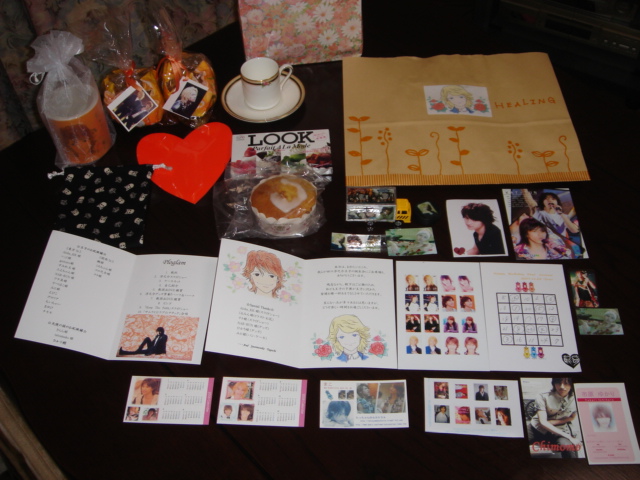 昨日お友達に誘われて、じゅんのの誕生日をお祝いしてまいりました~。ここまで本人がいない中素敵なパーティを経験をしたのは初めててでした!!スタッフの方々、本当にありがとうございました!!そしてお疲れ様でした~。昨日頂いた物の数々です!!帰って来て早々テーブルに並べて主人に見せびらかしました。(笑)真ん中へんにあるじゅんののイラストが書かれている物は、スタッフからのメッセージカードでした。そして、その左のが、プログラムカードで、また内容が素晴らしかったです!!1.乾杯2.淳之介スライドショー3.ケーキカットお友達が愛情をたっぷり注いで作ってくれた手作りケーキが!!素敵でしょう~!!更にお店の方に頼んであったケーキにも美童の文字が!!プログラムの上にある黒の巾着にカードが入ってて、当たった方がじゅんのの役、姫の役に選ばれてケーキカットしました。4.自己紹介5.歓談&DVD鑑賞6.淳之介グッズ争奪!!ハーフ&ハーフカツ2で行っているゲームです。これまた巾着の中にお題が入ってて、それを端から読んで、オレンジのハートの紙を使ってYESだったらオレンジ、NOだったら裏の白をだして行いました。ここでゲットしたのが、紙袋左下にある、KAT-TUNデコ車です。これ作ってくれた方はたっちゃんファンの方だったのですが、この日の為に作って来て下さったそうです。大きく写す事は出来ないのですが、本当によく出来てて凄いんですよ~。そうそう、凄いといえば、こんなお人形を作ってこられた方もいてビックリ!器用ですよね~。 どちらも凄いですよね~!!あと、お人形を作られた器用な方が、手作りのデニムで作ったオタバックや、通帳入れ、ポーチ?なども作って来てくれてました。7.歓談&DVD鑑賞8.ビンゴ大会ここでは、各自持ち寄った商品を当たった方から選べると言う物でした。私はチョコの上にある、白いカップでした。みとちゃん、ありがとう~。9.「Keep The Fairh」スライドショーこれ、こんな凄い事をプロでもないのに出来るんだ~って言うくらい素晴らしい物でした。10.「サムライ☆ラブ☆アタック」合唱最後にカラオで全員で歌ってお開きになりました。で、凄い!と思ったのが、まるで結婚式の引き出物のようにお土産があったのです!それが、右上にある紙袋に、左上にある手作りカップ、隣の手作りパンです。私は作ってくれたみとちゃんの分まで頂いてしまったので2個あります。昨日は銀座のカラオケルームで行ったのですが、東京組みだけでなく、新幹線に乗って駆けつけてくれる方も何人もいてビックリ!!更に、北海道から来れない方から、パーティ中にお祝いのお花まで届いて更にビックリ!!そして、同時に大阪でも淳誕祭が開かれてて、途中TV電話でお互いの様子を見せてたのもビックリ!!凄かったです。最後の方になってしまいましたが、お部屋には素敵なディスプレイがされていました。こちらです。よぉ~く見るととても凝っているんですよ~!!本当に素敵な淳誕祭でした~。昨日お会い出来たたくさんの方、本当にありがとうございました。楽しかったです。名刺を頂いた方、必ず時間を作ってブログに遊びに行かせて頂きますね。帰って、主人が作ってくれた、今話題のカレー鍋と、生ハムとルッコラのサラダを頂きました。カレー鍋、かなり当たりでした!!美味しかった~。今朝はそこにうどんを入れて頂きました。なんか疲れがたまってて、朝キツかったので、お洗濯とお掃除を済ませて3時間ほど寝てしまいました。今日休みで良かった~。さっ、主人の帰るコールがあったらので、そろそろこのへんで。皆さんの所に遊びに行けなくてごめんなさい。また時間を作って必ずお邪魔しますね~。では!