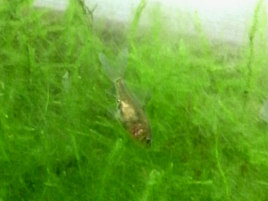 先発の稚魚が大分大きくなってきました。全長2センチくらいでしょうか・・・動きも活発です。殆ど餌をあげていないのですが、そこらじゅうに湧いている藻を食べているのでしょうか、やたら元気です(^^;ということで写真をパチリッ やっぱり上手く撮影できませんでした・・・