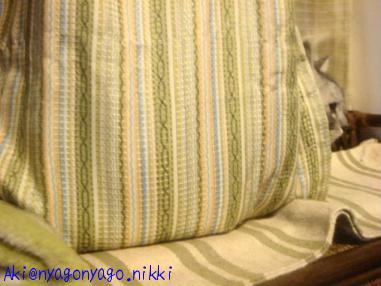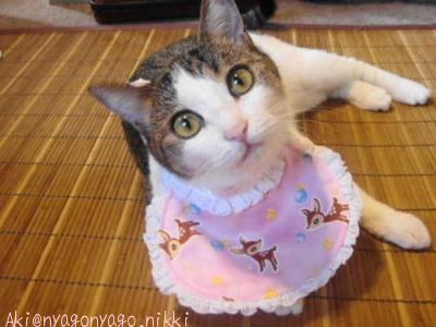 こんにちは。ぴよ母Akiですとってもステキングなプレゼントが届きました「くんくんくんくん・・・ みーすけくんの においが しますにゃ」お友達の猫乃宮さんのブログが、先日11111アクセスを迎えられ、11109を踏んだぴよ母、『キリ番おしかったで賞』 をいただきました猫乃宮さんのお母様がとっても器用なおかたで、今までにも素晴らしい作品の数々を、ブログに載せていらっしゃるんですよ。前回10000の、キリプレのお母様の作品がとぉっっっても素晴らしかったので、いつかぴよにも!! と思っていたのです。こんなにすぐに願いが叶うとは~~~~!! うるるるこちらですの・・・って、並べてたら、ぴよが上にどっかりと座ってしまった気を取り直して・・・ こちらですの猫乃宮さんのお母様が作ってくださった、よだれかけエプロンですぅ。バンビちゃんの布地が3色あったので、3つも作ってくださったのだそうです♪それに、お母様譲りで手先が器用な猫乃宮さんがお作りになった、猫乃宮さん作の、便箋! イラストも、猫乃宮さんがお描きになったんですよ~♪心温まる手書きのお手紙もいただきました忘れちゃいけない、ぴよたんと記念撮影もちろん、カメラ目線も忘れませんよ♪それではさっそく、ぴよたんに着けてもらいましょう~~~まずは、ぴよたんカラーの、ピンクからくぅ~~~~~~っ かわいいちょっとエプロンが曲がってしまいましたが・・・じゃあ次は、ブルーねうんうん、これもかわいいよぉ~~~いつもは着せない色だから新鮮ですぅ。それでは最後に、イエローをわは~~~ これも、かわいい~~~(ただの親バカ)皆さん、いかがでしょう? 何色のぴよたんがお好みですか???せっかく3色あるので、みいことナナコにも、着けさせてもらおうっと♪と、うきうきでナナコの元に行ったのですが・・・洗濯ネットを入れたまま、洗濯カゴを置いておいたら、そこにすっぽり入って、寝ていましたうちの洗濯カゴね、大正時代のお風呂屋さんのカゴなんですよ。アンティークショップで買ったの。 かわいいでしょ?寝てるのに起こすと、またシャーって言われちゃうから、やめておこう・・・じゃあ、みいこにブルーのエプロンを着けてみようっと♪王様みいこ、体は大きいのに性格は赤ちゃんだから、似合いそうだな~みいこ赤ちゃ~~~~~~~~~~~~~ん(と呼びかけながら、装着中♪)似合うと思ったんだけど・・・実際、似合っているけど・・・もう少し、かわいいお顔してくれませんか???明日はね、このエプロンでもっと楽しんじゃうよ!! シダ編み食器かご(特々大)↑ 食器かごとして紹介されていました♪ もう他のお店は全部売り切れだって~ 2007年版の、365カレンダーオールキャットPart2 に、ぴよたんを登録しました見てね! ロールケーキぴよたん♪ → 11月7日あと37にゃんの登録がないと、カレンダーが作られないのですぅ。ご興味あるかた、よかったらのぞいてみてくださいね同じカレンダーに登録しているお友達♪みー。さんちの ノビたん&スネぴょん幸せコイコイさんちの イヴくんbabycat98さんちの ビビパパCREA姫さんちの やまたんかんちゃん!!さんちの ニコさまたまかママンさんちの たまかちゃん猫乃宮さんちの みーすけくんangelxkissさんちの プリンちゃん 猫ブログランキング、いつも応援ありがとうみいこの、『お肉バナー』 を作ってみました!王様のお肉をぽちっとしてねよだれかけがとっても似合う あかがお・ぴよたん に今日も応援の ニャゴニャゴくりっく よろしくお願いします