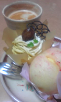 昨夜のおやつ♪『まるごと桃のケーキ』と『ふわふわモンブラン』カフェオレと共に 『丸ごと!モモ~!!!のケーキ』 かわゆいのdesu。 ふたつに割ると・・・ 中からは・・・桃太郎!じゃなくって・・・ とろーり!カスタード♪でした。 桃はそのままでも美味しいのっ♪ これから桃の季節ですね~うれしいな