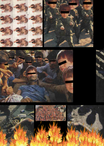 憲法記念日に山田維史『深く密かにファシズムは進む』コラージュ 2012年5月3日Tadami Yamada《Fascism Going Profoundly and Stealthily》Collage, 3 May, 2012山田維史『230万の死せる日本兵士に捧げる』フォト・コラージュ 1991年5月Tadami Yamada "An Offering to 2,300,000 Japanese Soldiers Who Died in The Second World War" Photo collage, May 1991: An illustration for a book.