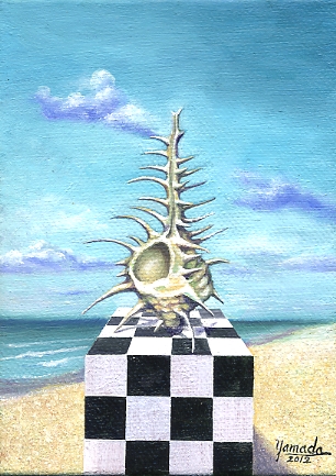 北九州の大雨の被害はすさまじい。東京も今朝方まで降っていたが、すでにすっかり晴れ上がって、午後一時になる今は、ひどく蒸し暑い。我が家も節電態勢で、エアコンデショナーを止め、窓を開け放っている。といっても、原発再稼動に賛成しているわけではない。東電をはじめとして電力各社に対する不信は決して拭いきれるものではないし、原発が再稼動された以上、われわれは地雷の上に座り込んで、自らの破滅・消滅を無気力に待っているようなものかもしれない。その地雷の威力は、10万年後まで効果が持続する。海外資本が日本の国土を購入していることが問題になっているが、日本人もまた、自らの手で自らの国土を汚そうとしている。日本人は沢山の美点そなえている。が、ただひとつ、経験を智慧として見えない将来に生かす能力に欠ける。個人個人としてはともかく、社会制度として経験が機能することは稀と言ってよいほどだ。それがなぜかを問う分析は、いまのところ学問として手つかずである(自己分析が不得意なのだから当然であるが)。この国の政治家も企業家も、事が大きな問題になると、目先の利益を離れた長いスパンの将来圖を描く能力が俄然低くなる。これは党派の能力の問題ではない。他党の失敗をあげつらうことはできても、それに代わる緻密な設計図が描けるわけではない。政治とは目先の問題処理だと言ってしまえばそれまでだが、どうやら政治家のみならず、彼らを政治家たらしめている我々国民の気質のなかに、それはあるかもしれない。ともあれ、この夏を元気にのりきりましょう。暑中お見舞い申し上げます。山田維史《貝の塔》油彩 22×16cm 2012年7月Tdami Yamada "A Tower of a Shell" Oil on canvas, 2012