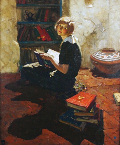 19世紀以後の絵画のなかに、ぽつりぽつりとではあるが、「読書する人」とジャンル分けできる作品がある。17世紀にはフェルメールの作品で知られるように、「手紙を読む女性像」が好んで描かれた。「読書する人」も、じつは女性像が圧倒的に多い。しかし、「手紙を読む女性像」と「読書する女性像」とは、似ているようでいて喚起される物語とでもいうようなことが全くことなる、と私は見ている。画家の描こうという動機が、異なるということだ。詳しくここに述べはしないが、19世紀の画家は、読書する女性に新しい女性美を発見した、と言えるのではあるまいか。 前世紀、すなわち18世紀、特にイギリスのヴィクトリア朝においては、女性は心身ともに抑圧されていた。身体をコルセットでまるで拷問のように締め上げ、ソフィステケイトの名のもとに極端なほどに自他からの性的抑圧をこうむっていた。ジグムント・フロイトの精神分析学は、ヴィクトリア朝の女性のヒステリーの研究に始まる。「読書する女性像」はその後に台頭してきた絵画上のテーマなのである。 我国の明治期の油彩画史に大きな位置をしめる黒田清輝の『読書』は、1890年、留学先のパリで描かれ、同地のサロン展で賞賛された。私はこの『読書』を上述のように図像学的見地から鑑賞することができると、述べておこうと思う。 というわけで、以下に、少しばかり図像を掲載してご覧にいれる。Dean Cornwell (1892-1960, American) "Portrait of a Young Woman Reading"Delphin Enjolras (1857-1945,French) "Reading by the Lamp"Sara Hayden (Unknown)"Girl in Green" 1899, Collection of Sheldon Memorial Art Gallery, USAThomas Wilmer Dewong (1851-1938, American)"Portrait in a Brown Dress" c.1908Ulisse Caputo (1872-1946, Italian) "Reading"Unknown artist "Reading"Agnes Goodsir (1864-1939, Australian) "Reading"Alfred Lambart (1902-1970, English)"Juliet, Daughter of Richard H. Fox of Surrey" 1931黒田清輝(1866-1924) "読書" 1890, 東京国立博物館蔵