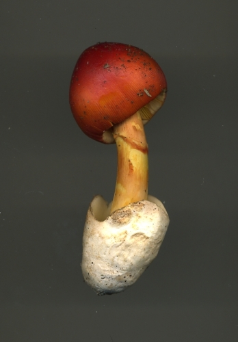 約束があって午前中に外出した。随分早く到着したので、近くの高幡不動を散策した。 金剛寺境内から不動ヶ丘の山中に入る。四国八十八カ所を招来した巡礼コースをたどりながら、鎌倉時代の高幡城址まで登った。山頂が平坦になっていて、その昔、高幡城という山城があった場所といわれている。今は、鬱蒼とした木立があるばかりで、遺構が存在するわけではない。 高幡城址をはじめ、この一帯は、八王子城址、滝山城址、浄福寺城址(案下城址)、小田野城、初澤城址、片倉城址、平山城址、平山北城址など、鎌倉時代には多くの小城があった。なかには物見櫓程度のものもあったようだが、鎌倉時代後期には後北条氏の領地であったこともあり、武蔵野と鎌倉とを結ぶ要所だった。 なるほど今でも高幡城址に立てば、周囲360度を一望できるのである。 朝、8時半、すでにリュックを背負ったハイカーも山道を登っていた。いたって静かな林のなかで私は、小さな地蔵尊像をたどるように小1時間散策した。梅雨どきには山紫陽花が群生することで有名なのだが、いまはツユクサやヌスビトハギ、それにマンジュシャゲがところどころに咲いているばかり。道には松ボックリがたくさん落ちていた。 ところで、私はふと奇妙なものに目をとめたのである。 初め、遠くから、梅の実の大きさの真っ赤に熟した木の実に、白いキノコが寄生しているのだと思った。赤い実は、虫に食われたかのように穴が開いていた。私はその赤い実が何であるかが気になり、また、その実からゾックリ茎を出したキノコの正体も気になった。で、近づいて、手に取った。 「???・・・なんだこりゃ?」 赤い実と思ったのは、キノコのカサだった。虫食いの穴から内側が見え、キノコの茎がカサに付いていた。それでは白いキノコと思ったのは・・・これもキノコだった。赤いカサの内側から出た茎が白いカサの内側にしっかりくっついて、つまり一体化している。が、白いカサの内側にはキノコ特有のヒダがないことから、どうやらこの白いカサは、赤いキノコの茎を保護する外套のようであった。 初めて見るキノコだった。私は大きな樫の枯れ葉を拾ってキノコをそっと包み、こわれないように胸のポケットに入れた。帰宅してから調べようと思って。 約束の用事をすませて急いで帰宅し、手持ちの図鑑を開いた。 私が所持している菌類図鑑は、保育社『標準原色図鑑全集14; 菌類』、 "A colour guide to familiar MUSHROOMS" By Dr. Mirko Svrček、および牧野富太郎『新日本植物圖鑑』である。 しかしいずれにも該当するキノコはみつからなかった。 ただ、根元の白い部分は、菌壷といわれるものであろうことが分かった。どんなキノコにもあるのではないが、「すっぽんたけ科」や「かごたけ科」、そして「まつたけ科」の「たまごてんぐたけ」(毒キノコ)にみられる「脚包」と呼ばれるものが、それらしかった。 赤いカサのキノコ本体は、「アカヤマタケ」あるいは「トガリベニヤマタケ」かと思われるが、カサの形状に関する記述からすると、断定はしかねる。 「アカヤマタケ」「トガリベニヤマタケ」はその名にも示されているように、円錐状のとがったカサをしている。成長が進むと開くということだが、私が採集してきたキノコのカサは、写真で示したように、全然とがってはいない。むしろ丸みを帯びた鳥卵状である。また「アカヤマタケ」「トガリベニヤマタケ」が、菌壷、ないし脚包をもっているかどうかも図鑑には説明がない。ただしカサは、触れると表面がやや粘液状でベタ付く、というのは同様である。 残念ながら、いまのところ、このキノコがなんであるかの判断は保留である。 ともかく画像をご覧いただこう。