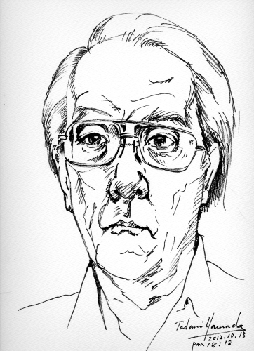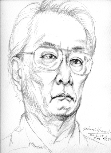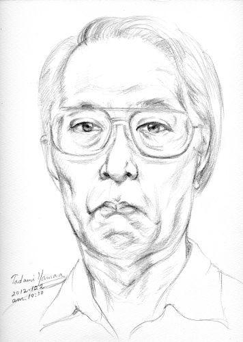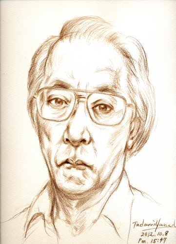 私の母校、会津高等学校の同学年同窓会が夏前に開催されて、一昨日、その事後報告が送られてきた。 このブログで一度書いたことがあるが、添付された集合写真を見ても誰が誰だかまったく判断がつかない。代表幹事の言葉に、「まもなく古希を迎えるので」とあったので、それはそうなのだが、当惑してしまった。 自分で自分の有様に気づかないでいるかのように思われたのだ。 私は日記でも年齢を明かして書いている。自分自身を「年寄り」とまで表現してきた。・・・だが、じつのところ、病気をして肉体的なダメージを蒙ったこともないし、肉がたれさがっていることもないので、そこまで衰えているとはまったく思っていない。 もちろん、1年前から血圧日記を付け、一日の食事記録も付けたりしているので、自分の年齢ははっきり意識している。年寄りの冷や水などということはやらない。そういうことを無思慮にやって脳梗塞で半身麻痺になり死んでいった友人を見ているからでもある。 私たち同学年卒業生は295名だった。このたびの報告書によれば、すでに亡くなった者が、判明しているだけで27名だという。ずいぶん早い死だ、と思わずにはいられない。 中学時代の体育教師だった故S先生と40年振りに連絡がつき、お電話を下さったとき、「山田くんはヒョロヒョロしていたから、もう死んだんじゃあんめかと思っていた」と、おっしゃった。 「それが、いたって頑丈になってしまいまして・・・」と、私は応えたのだったが。 自画像日記と称して、1年間自画像をスケッチした時から14年が過ぎた。そろそろ再び自分の顔を見直してみようか、と思っていた矢先に、同窓会の写真がとどいたのだった。 きょうから10月である。きりがよいので、朝、さっそくスケッチブックを取り出して10分ほど描いてみた。描きながら、「なるほど、年寄りの顔だわい」と思った。今日の自画像