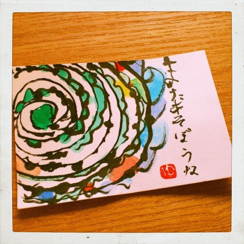 娘(小1)が放課後に絵手紙教室に参加してきました。はなまる?と思ったら、貝だそうです。サザエかな?なかなかの出来だったので、パチリ