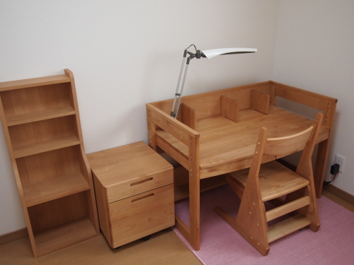 入学準備シーズンですね。新一年生の学習机、まずは買うか、買わないかで悩むところですが、我が家は私自身が学習机をかなり使っていた記憶があるので、去年娘が入学を迎えるにあたって、購入しました。こだわった点は「天然木、シンプルで長く使える物」ということです。お財布とも相談し、決まったのが、堀田木工さんのムービー。ネットで夜な夜な探し回り、近所の家具屋さんにも見に行ったところ、たまたま第一候補のムービーが置いてあり、実物もすごく良かったので即決しました。アルダー材のオイル仕上げ、国内生産という点も安心です。娘も、ピンクとかキラキラした机を欲しがるかと思いきや、意外と実物を見たら気に入った様で、「木がすべすべで気持ち良いー!」とか言って触りまくっていました。去年搬入した時の写真です。部屋が殺風景で、ただ置いただけって感じですデスクの下のラグもおまけに家具屋さんがつけてくれた物をそのまま使っています。そのうちコレが汚れてきたら、娘の好みのものにしよう↓楽天さんにも同じのありました。椅子もライトもたぶん同じです。デスクの上の本立ては取り外せます。実際、一年経って、宿題はほとんどダイニングテーブルでしています。教科書も一階の和室に棚を作って置いています。なので、勉強机としては機能していませんが、今はお友達が来て、工作したり、絵や手紙書いたりに大活躍しています。そのうち、この机でう~んとお勉強してくれるよねぇ。姉さん