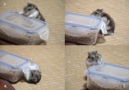 つぶちゃん「ぼくの大好きなインコさんのうまうまのにおいがするでちゅ。」「このフタのすきまからにおいがするでちゅ!」「開かないでちゅっ。」「ぽこ、開けて!」この後、ひとつひとつていねいに殻を剥いて食べていました。どんなに小さかろうと、殻があるものは剥いて食べるようです。