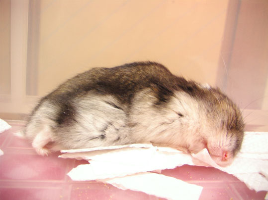 みなしゃん、ぼく「こめつぶ」でちゅ。ぼく、最近元気がないんでちゅよ。これは月曜日のぼくでちゅ。膨らんだお腹が分かりまちゅか?「腹水」という病気を抱えて生きていかなくちゃならなくなりまちた。お腹に溜まったお水のせいで、呼吸は荒く、食欲もありましぇん。うんこが驚くほど貧弱過ぎて、ぽこがすごく心配してまちゅ。お腹が重くて、歩くとよたよたなってしまうでちゅ。月曜日、病院に連れて行かれまちた。1日3回、1滴ずつ利尿剤(フロセミド)を飲む事になったでちゅ。ぽこは、ぼくが帰るサインを出すまで手の上で寝んねさせてくれまちゅ。やさ~しくなでなでしてくれるでちゅよ。食欲のないぼくに、ぽこは「スペシャルミックスうまうま」を作って数時間おきに食べさせてくれまちゅ。酸素スプレーも使ってくれまちゅ。でも、ぼくの病気は治らないんでちゅ。つぶちゃんの本格的な闘病生活が始まってしまいました。呼吸の荒さにはだいぶ前から気付いていましたが、「腹水かもしれない!」と気付いたのが日曜日でした。本当はつぶちゃんを病院に連れて行きたくはありませんでしたが「診察しないと薬は出せない」と言われ仕方なく連れて行きました。首をつまみ持ち上げられ、お腹を触られるつぶちゃんはとても可哀相でした。ものすごいストレスと恐怖を感じた事でしょう。ようやく下ろされたつぶちゃんは、しぼりだすような声で鳴きました。ごめんね、つぶちゃん。がんばったね。もう病院へは連れて行かないからね。おうちの寝所へ戻れたつぶちゃん。所が、体重が測れていなかったらしく、またつぶを出すハメになりました...。あんな目にあった直後なのに、手を差し出すと自分から乗ってきてくれたんです!驚きました。そんなに私を信用してくれてるのかと思うと、涙が出そうな程うれしかったです。月曜の夜から利尿剤を飲ませていますが、体重が減りません。もし「腹水」の事で何か知ってる方がおられましたらアドバイスをいただけますよう心よりお願い申し上げます。つぶの事を心配してくれたみなさん、本当にありがとうございました。うれしくて涙が出そうでした。最後まで読んで下さりありがとうございました。つぶのためにがんばります。 たねぽこ