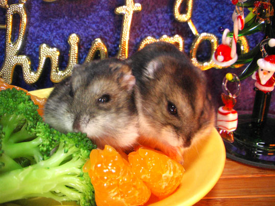 クリスマス☆イヴ パ~ティ~!!左:こめつぶ 右:たけのこ「わ~い!」のこ「ぽこ、ハロゲンがまぶしいでちゅ」毛繕いに夢中な“のこちゃん”と、ブロッコリーに夢中な“つぶちゃん”。まだ毛繕いに夢中な“のこちゃん”と、ブロッコリーをもぎ取る“つぶちゃん”。のこ「そろそろブロッコリーでもいただくでちゅ。」と思いきや…… 。のこ「つぶどん、何かあるでちゅよ♪」集中力の無い“のこちゃん”(^-^;) いったん帰宅させました。(笑)つぶちゃん、ブロッコリーを一人占め♪とってもごきげんなご様子。ブロッコリーを持つお手手がとってもかわいい“つぶちゃん”。しばらくお昼寝をして集中力を高めた“のこちゃん”☆のこ「とってもおいしいでちゅ♪」のこ「とってもおいしいでちゅけど、みかんって糸のように長いたべものでちたっけ?」のこ「むむむっ。それっ。」あきらめたようです。違う所を食べ始めた前向きな“のこちゃん”。つぶ「ぼくサンタさんになったでちゅよ!ぽこにみかんのプレゼント持って来たでちゅ。」たねぽこ「ありがとー('v')とってもうれしいよ!」たねぽこ「あれ?少し食べてない?つぶちゃんサンタさんは食べちゃダメなんだよ。」 つぶ「ぼく、サンタさんやめたでちゅ。モグモグ。」
