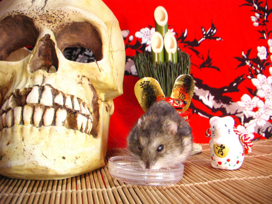 写真:こめつぶつぶ「みなさま、おひさしぶりでちゅ。ぼくは今豆乳をいただいてるでちゅ。」つぶ「のこどんは今寝てるそうでちゅ。お先にいただくでちゅ。」写真:たけのこのこ「おはよう。」のこ「何だか邪魔でちゅね、このねずみどん。」ねずみ(助けて)ねずみ(助かった)のこ「これ、ぽこのしゃれこうべ? では、みなさま。」のこ「あけましておめでとうございまちゅ。」ねずみ(・・・。)