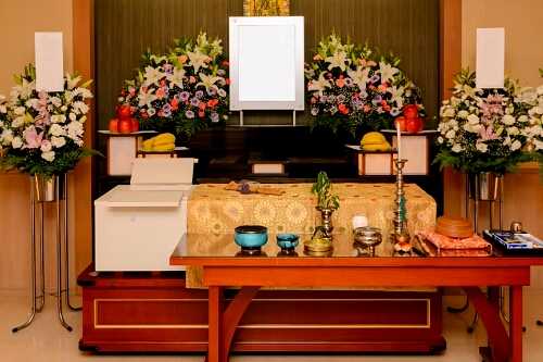 これまた会葬者の人数にあわせて部屋を確保して、祭壇のお花やお料理も全て用意するし、霊柩車の手配から宗派に応じて提携してるお寺も紹介する。