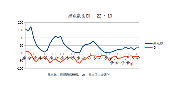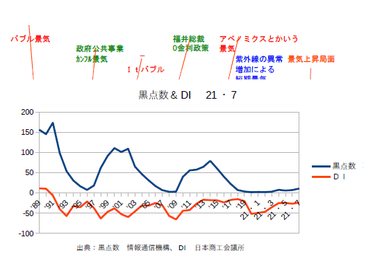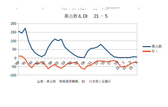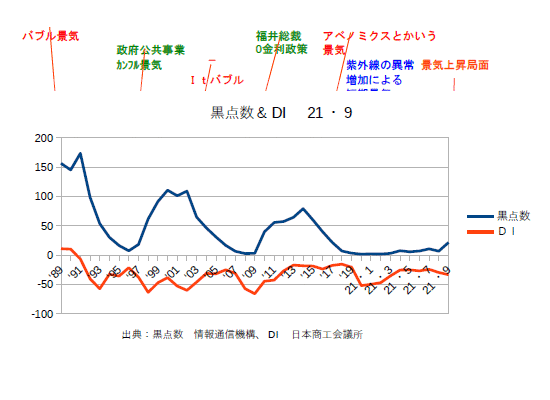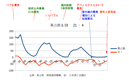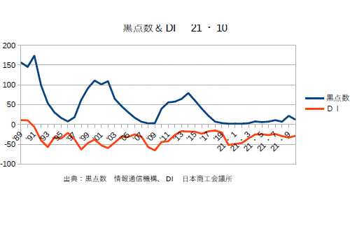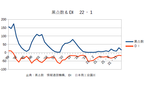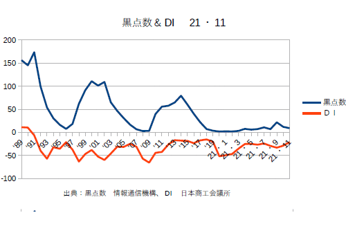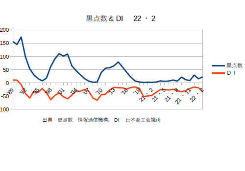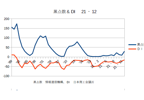 21年12月分の黒点数&DIを更新。業種によってバラつきはあるものの、DIは確実に上がってきている。あとはオミクロン次第というところか?