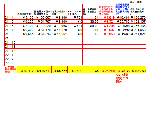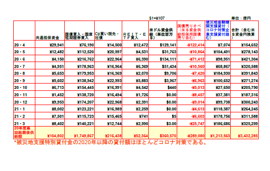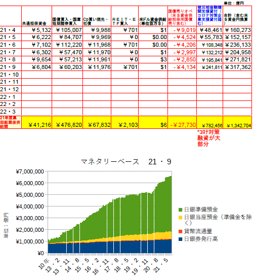 10月26日:トップページの「日銀マネタリーベース」9月平均残高を更新。10月27日:トップページの「日銀コール市場資金供給額」を2021年9月末まで更新。被災地支援&コロナ対策融資という欄はほぼ全額コロナ対策のための融資資金である。政府や都道府県の協力金なるものは申請しても振り込みがめちゃくちゃ遅かったり、あるいは”美容院なのにタクシー免許が無いから申請を受け付けられない”という嫌がらせをしているのか?と思えるような事態が起こっていたりしたが、日銀から金融機関に流される資金は比較的小規模な店舗でも数千万の融資が受けられたり、何とか機能しているようである。ところで、昨年の12月にHPのファイルアップ用に使っていたhpのパソコンが、オンラインゲームをやっていたからなのか、CPUが煙を吹いて壊れてしまい(やはり今時のゲームはディアルコアなどでは対応できないようである)、昨年中古で買ったDELLのパソコンはどうやってもサーバーにアクセスできず。仕方なくブログでパソコン内のデーターを発表してきたが、この度富士通の中古パソコンを買ったところ何とかサーバーにアクセスできるようになった。いやはやデジタルの世界も大変であるf^^;)