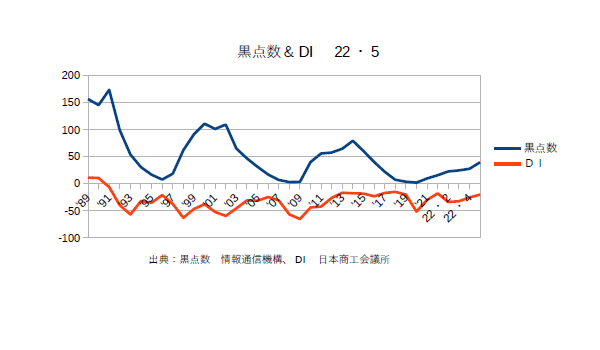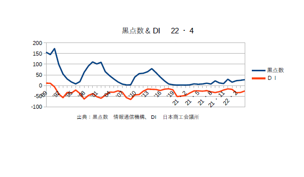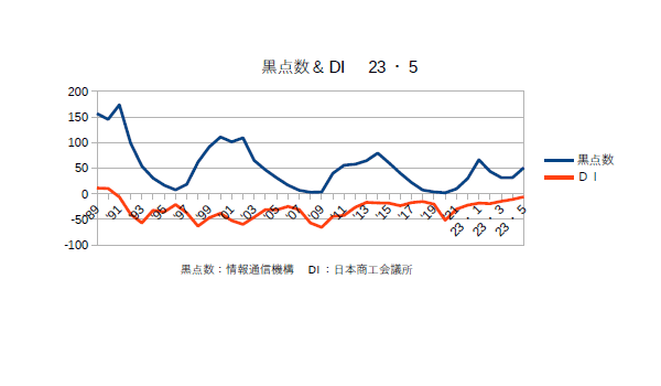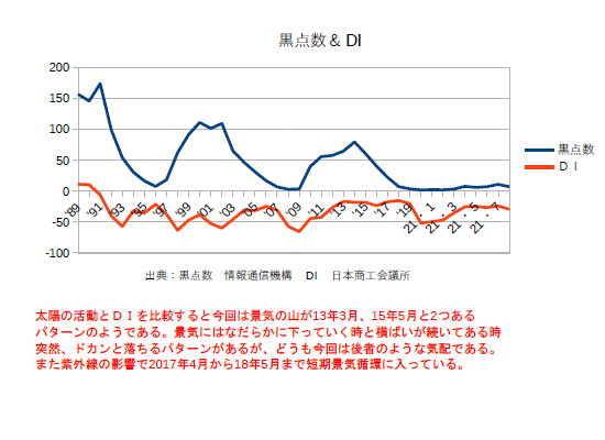 6月13日:「経済」分野・「おいらの景気変動理論」に「太陽活動と景気変動 2023・5月分まで」更新。黒点数、DI共に順調に上がっている。日本商工会議所によると「行動制限のない大型連休に加え、コロナの5類移行による消費マインドの改善、インバウンド・国内観光需要の回復で、飲食・宿泊関連のサービス業、百貨店・土産品販売等の小売業で改善した。また、製造業では、底堅い国内の設備投資需要の下支えで改善し、卸売業でも製造・小売・サービス業からの引き合い増加で改善した。建設業でも、政府の補正予算による公共工事の受注増で改善した。原材料・エネルギー価格の高騰や人材確保に向けた賃上げ等のコスト負担増、需要回復に伴う人手不足、価格転嫁が十分に追い付いていない等、経営の重荷は多いが、経済活動のさらなる回復で、中小企業の業況は改善が続いている。」とのことだ。商工会議所のDIは調査が政府より早くより太陽との整合性が高い。一般的には”政府の指標の先行指数”と云われている(^・・)