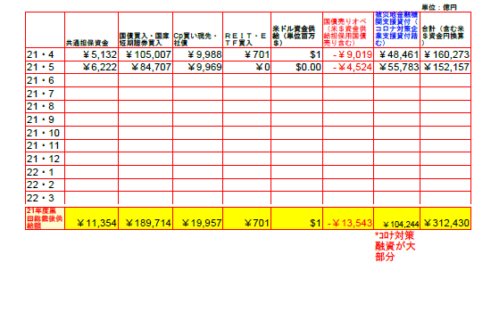 5月の日銀資金供給(オペレーション)とマネタリーベースの結果は以下のとおり。REIT、ETFの買い入れは無し。米$資金供給も無し。コロナ対策用融資資金は5兆円を超える資金を金融機関に流している。しかし”出口”であるマネタリーベースの日銀準備預金、当座預金は一時横ばいだったものの、ここ数ケ月再び上昇し始めている。つまり日銀から新型コロナによる飲食店・旅行業などへの融資資金として金融機関が受け取ったものの、既に今迄の融資で金融機関の審査が通らずに融資されず、余った資金が日銀に返されていることを示している。政府・東京都の協力金とやらも支払いが数ケ月も払われてない状況であるらしいし、こうなったら飲食業や旅行業の組合は支払われていない協力金を国なり都なりの債務であると裁判所に弁護団を立てて告訴し(債務存在確認の訴え)所定の期間内に全額支払わない場合は支払い命令書の発行を申請し、それを基として都庁の土地・建物を差し押さえ処分とするしかあるまい。これで五輪を強硬に行って再び感染者が急増する事態となったら、次の総選挙で自民・公明は政権を失う可能性が高まるだろう。”地獄のオリンピック”となりかねない。例のインド株の初期症状は味覚・嗅覚異常が起こらず普通の風邪とまったく同じであるらしいし発熱もほとんど無いらしい、日本はこういう事態になっても全員にPCR検査はしないのである。。愚の骨頂。(^・ω・^)