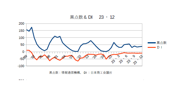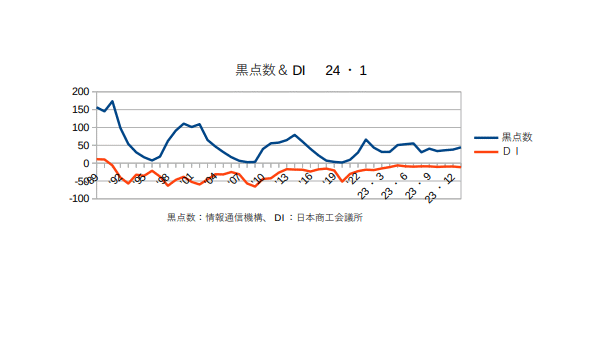 1月16日:「経済」分野・「おいらの景気変動理論」に「太陽活動と景気変動 2023・12月分まで」更新。物価高もペースが鈍り、DIは順調に高止まりしている。商工会議所では「全産業合計の業況DIは、▲8.4(前月比+1.3ポイント)。製造業では、自動車関係や飲食品関係の需要増がけん引し、改善した。また、サービス業では、経済活動の回復に伴い、忘年会等の年末需要が増加した飲食・宿泊業を中心に改善し、卸売業でも、飲食・宿泊業からの引き合い増加で改善した。一方、建設業では、公共工事の受注が下支えする中、資材価格の高止まりでほぼ横ばいにとどまり、小売業では、物価高による消費者の買い控えの影響で悪化が続いている。エネルギー価格の高騰や人手不足に伴う人件費の増加等、コスト増は業種を問わず続いている。また、深刻な人手不足や適正な価格転嫁への対応等、経営課題は多く中小企業の業況は7か月ぶりに改善を示すも、力強さを欠いている。」とのこと。