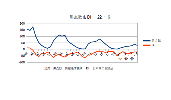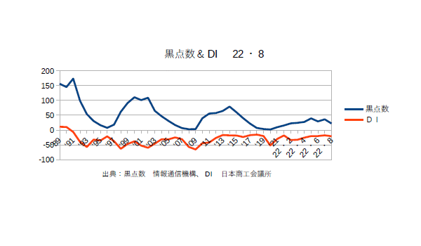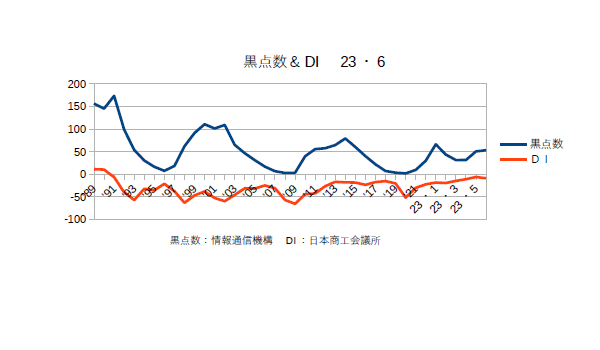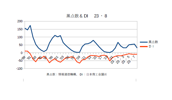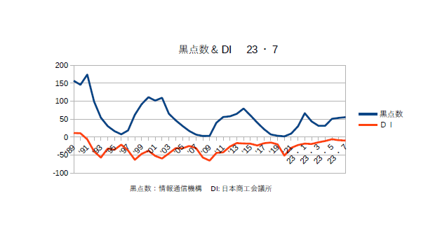 9月1日:「経済」分野・「おいらの景気変動理論」に「太陽活動と景気変動 2023・8月分まで」更新。まあ、黒点数としては月別だとグラフがデコボコしているが年平均だと確実に上昇しておりピークは来年あたりになりそうである。福島原発の処理水に関して現地の漁民は早くから”風評被害”を口にしてきたが、その”風評”を意地になって流し続けているのは”中華珍民共和国政府”である。福島の漁民は”そのような作戦”を知っていたのだろうか??中珍は日本を責めるがその日本の10倍も”汚染水”を垂れ流しているのは中珍自身であるし、簡単に中珍政府のフェイクを受け入れるように”洗脳”されている珍民たちも”ヤバい”連中だと思う。かの国は元々肉食民族で魚は鯉くらいしか食わなかったのであるから、この際中珍への輸出は止めてもっと国内で流通させるようにすべきだろう。(最近魚が高いので余り食べてない)さて、商工会議所のコメントである「全産業合計の業況DIは、▲8.9(前月比+0.9ポイント)。小売業は、インバウンド需要の回復等で売上が好調な百貨店が牽引し、改善した。サービス業は、夏休み需要で飲食・宿泊・観光業を中心に改善も、物価高や天候不順の影響で力強さを欠いた。建設業は、資材価格の高騰によるコスト増が重荷となり、ほぼ横ばいとなった。また、製造業は、エネルギー価格の高騰によるコスト増で悪化し、卸売業も、国内需要回復の鈍さから引き合いが減少し、悪化した。物価高で内需に力強さを欠く中、原材料・エネルギー価格のさらなる高騰でコスト増が続いている。また、深刻な人手不足に加え、労務費等の上昇分までの十分な価格転嫁も行えておらず、中小企業の業況は横ばいに留まっている。」とのことだ。(^・・)