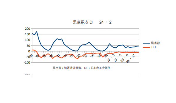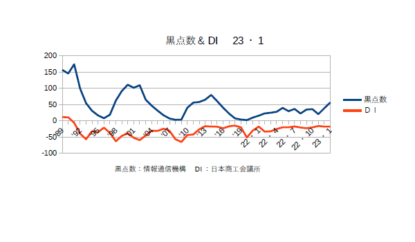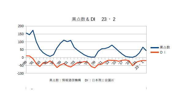 2月21日:「経済」分野・「おいらの景気変動理論」に「太陽活動と景気変動 2023・1月分まで」更新。DIも黒点数も大体アッパー圏。欧米に比べて円安もあって割安感のある日本株が買われているが、個々の企業は別として全体の基調としては来年‘25年まではこの傾向は続くと思われる。まあ、コロナ禍の時に買った株は今年後半くらいから利益確定でポチポチ売っていくべきだと思うが。商工会議所では「全産業合計の業況DIは、▲11.4(前月比▲3.0ポイント)。小売業は、5類移行後初めての年始を迎え、初売り等の特需がけん引し、改善した。一方、サービス業は、新年会需要は堅調なものの、深刻な人手不足で需要に対応が追い付かず、悪化した。また、卸売業は、買い控えによる日用品・飲食品関係の引き合い低迷で悪化し、製造業は、飲食品関係の受注減や、自動車関係の一部生産停滞で悪化した。建設業も住宅関係の民間工事を中心に弱含んでいる。物価高や賃上げによるコスト増、深刻な人手不足、価格転嫁対応など、長期化している経営課題は多い。加えて、元日に発生した能登半島地震による物流やサプライチェーンへの影響も重なり、中小企業の業況は悪化となった。」とのこと(^・・)