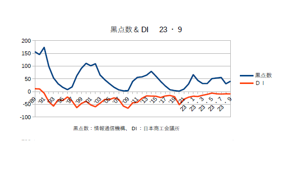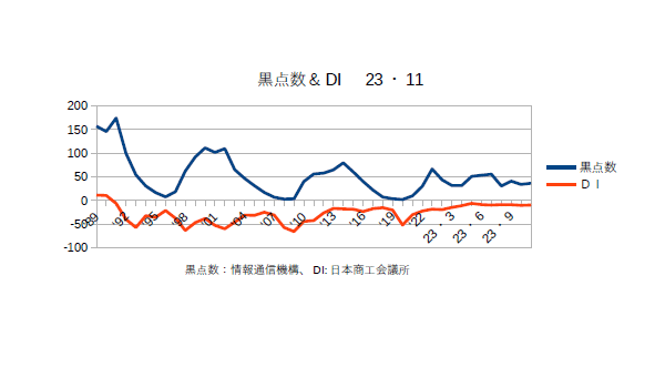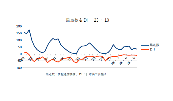 11月7日:「経済」分野・「おいらの景気変動理論」に「太陽活動と景気変動 2023・10月分まで」更新。DIはほぼ横ばい。テレビなどでは「不景気だ」の大合唱だが、実際はITバブルの時よりも景気は良い。むろん若い?女性がノーパンで踊りまくっていたバブルの時よりは悪いが。評論家の爺さんたちは何時と比べて「悪い」と言っているのだろう?と疑問になる。日銀もこの物価高を「2%程度」と見積もっているが、我々消費者の実感とはほど遠い。彼らは名目物価指数(これが消費者の実感に近い)-生鮮品の価格上昇分(コア指数)-石油製品の物価上昇分(コアコア指数)で算出しているので、気候変動による農産物の価格変動やウクライナ戦争、中東戦争の影響は加味されていない。今の物価高はまさにこの部分だと思うのだが?もし日本が不況だというのならそれは日銀の低金利(金融緩和)によってもたらされた「日銀不況」なのである。商工会議所のコメント「全産業合計の業況DIは、▲10.5(前月比▲1.5ポイント)。小売業は、物価高で買い控えが続く中、人手不足に伴う人件費の増加等で悪化した。サービス業は、物価高による生活関連サービスの需要停滞で横ばい圏内で留まり、卸売業は、小売・サービス業からの引き合い減少でほぼ横ばいとなった。製造業は、自動車関連が好調な一方、エネルギー価格の高騰によるコスト増が全体を押し下げ、建設業は、公共工事の受注増で改善を示すも力強さを欠いている。エネルギー価格の高騰や最低賃金の上昇等でコスト増が継続する中、これに見合った十分な価格転嫁が行えていない。また、深刻な人手不足に加え、インボイス制度等の諸課題への対応も重なり、中小企業の業況は悪化に転じた。」とのことである。