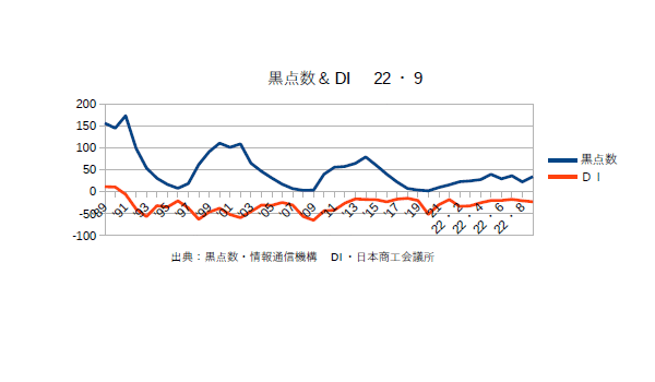 10月6日:「経済」分野・「おいらの景気変動理論」に「太陽活動と景気変動 2023・9月分まで」更新。物価高など様々な問題があるものの景気の上下方向(DI)は順調に上向きなようだ。商工会議所のコメントでは「全産業合計の業況DIは、▲9.0(前月比▲0.1ポイント)。建設業では、国土強靭化事業をはじめとする公共工事の受注が堅調に推移し、改善した。小売業では、高付加価値商品の販売やインバウンド需要が好調な百貨店が下支えし、改善した。また、卸売業でも小売業からの引き合い増加で改善した。一方、製造業では、円安の伸長による輸入部材の価格高騰により悪化した。サービス業では、慢性的な人手不足により、飲食・宿泊業を中心に、悪化となった。各業種の業況はまだら模様となったものの、エネルギー価格の高騰によるコスト増や深刻な人手不足等、業種を問わない課題は山積しており、中小企業の業況は4か月連続で足踏みが続いている。」とのことだ。今の物価高の最も大きな要因は言わずと知れた露のウクライナ侵攻による原油高にある。更に米国と日本との金利差による円安が拍車をかけている。企業、特に中小は賃金を上げたくともこれらによるコストを吸収しきれず”賃上げによる良い物価高”ではなく”原材料価格高騰による悪い物価高”を招いてしまっている。はっきり言えば”日銀金融政策の失敗による円安”が景気の足を引っ張っているといっても過言ではない。財務局による円買い介入だけではなく日銀法15条3項によって日銀も為替介入(ただし主要国との協議・了解が必要)ができるのであるから、金利上げがローン金利などの関係でやりづらいのであれば1$=120円程度になるまでは円買い介入をするべきだ!と思う。(^・・)