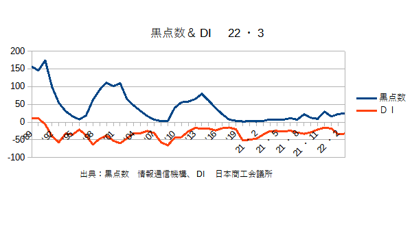 7月1日:「経済」分野・「おいらの景気変動理論」に「太陽活動と景気変動 2023・6月分まで」更新。黒点数としては3月・4月が落ち込んでいるが、黒点の人体に対する影響は累積なので月ごとの数値とは必ずしもピッタリ一致はしないことがある。年平均値で見た方がDI(景気の上下動)との整合性は高い。商工会議所のコメントでは「全産業合計の業況DIは、▲8.9(前月比▲2.7ポイント)。サービス業では、飲食・宿泊業等で需要回復は継続する一方、深刻な人手不足に伴う受注機会の損失で、業況は悪化した。また、小売業では、物価高により消費者の日用品等の買い控えが継続しており、スーパー等を中心に悪化した。卸売業でも、梱包資材価格の高止まりに加え、小売業・サービス業からの引き合い減少で悪化した。建設業・製造業では、設備投資需要が堅調に推移する一方、度重なるコスト増に価格転嫁が追いついておらず、横ばいに留まった。原材料・エネルギー価格の高騰や人材確保に向けた賃上げ等のコスト増加が継続する中、コロナ禍からの挽回消費にも一服感が見られ、中小企業の業況は悪化に転じた。」結局今のコスト増というのは露のウクライナ侵攻と日銀の0金利政策(正確には長期金利0.25~0.5)によって極端な円安になっていることが大きいのだが、中小企業への貸出金利・住宅ローン・不動産業界(関連業者が多いので影響が大きい)への融資金利が増加することを恐れて、日銀が金利を上げられないでいるためである。金利を0.25%づつ変動させるというのが日・米・欧の暗黙の了解?になっているようだが、特に法律で決っているわけでもないのだから、0.01%づつ上げてみて市中金利と円相場の動きを見る、というような臨機応変の対応ができないのだろうか?と疑問に思う(^・・)