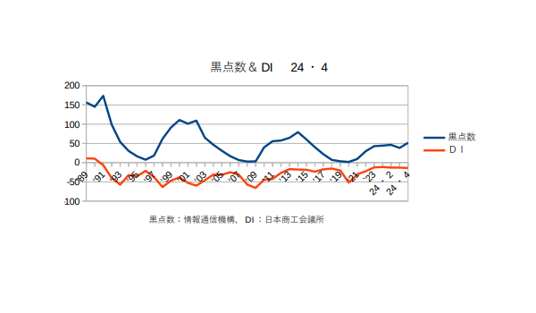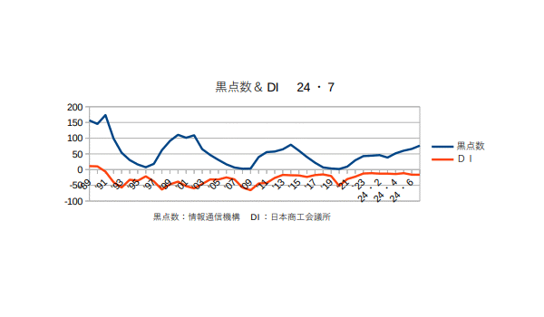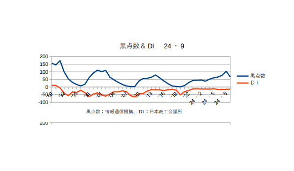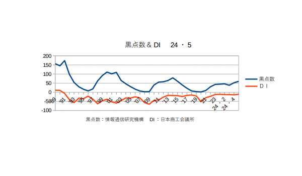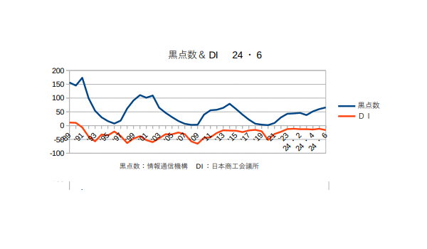 8月14日:「経済」分野・「おいらの景気変動理論」に「太陽活動と景気変動 2024・7月分まで」更新。太陽の黒点数は1日当たり100個を超えるようになった。日銀もようやく政策金利(短期金利)を0.25%に上げたし、これでしばらく様子見というところか?来年の恐らく後半には黒点数も景気も下りに入り始めるので、今いくらかでも上げておかないと2026年になったら打つ手がありませんぜ?(^・・)商工会議所のコメント「業況DIは、消費低迷の中、コスト増継続で横ばい。先行きは、消費拡大の見通し立たず、慎重な見方(LOBO調査2024年7月結果)日本商工会議所が31日に発表した7月の商工会議所LOBO(早期景気観測)調査結果によると、全産業合計の業況DIは、▲16.3(前月比▲0.1ポイント)。製造業は、物価高により企業の設備投資意欲に弱さが見え、機械器具関係を中心に悪化した。小売業・サービス業は、堅調なインバウンド需要が下支えするものの、長引く物価高による消費者の購買意欲の低下で力強さを欠いている。また、卸売業でも日用品や飲食品関係の需要減で弱含みとなっている。建設業では、公共工事の下支えで改善を示すも、人手不足やコスト増等の重荷は継続している。原材料価格が高止まりする中、激変緩和措置の終了や円安基調で、コスト負担増は継続している。また、日経平均株価は最高値を記録したものの、中小企業は価格転嫁等で恩恵を十分に享受できておらず、業況は足踏み状態となった。先行き見通しDIは、▲15.4(今月比+0.9ポイント)。定額減税や酷暑乗り切り緊急支援等による可処分所得の増加に加え、夏休み需要やイベント等による個人消費の拡大が期待される。一方、長引く物価高で購買意欲が低迷する中、輸送費や人件費の上昇、電気代の高騰等、コスト増は続いている。価格転嫁や人材確保等の課題も山積する中、抜本的な消費拡大の見通しは立たず、先行きは慎重な見方が続く。」つまり円安不況ということだ。