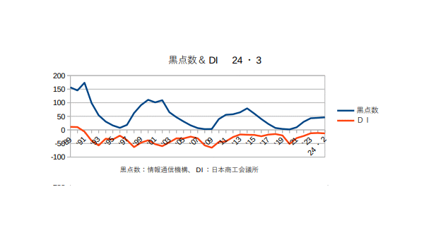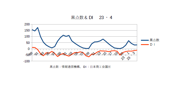 12月13日:「経済」分野・「おいらの景気変動理論」に「太陽活動と景気変動 2023・11月分まで」更新。おいらの採用しているDIは政府のデーターではなく商工会議所のものなのだが、政府のデーターは統計を取るのが遅くて実際の太陽の活動とリアルタイムとはいかないためである。逆に政府の統計を中心に見ている評論家からは商工会議所のDIは”先行指数”だと云われている。11月に集めたデーターは当月の月末に発表しているためである。商工会議所は中小企業が多く日本経済も7割以上が中小企業なので感覚としては政府の発表より国民の側に近いといえる。グラフとしてはバブル期を除けば商工会議所のDIが+(半分以上の企業が景気が良いと回答している)になったことはないので、そろそろこの辺で頭打ちかな?とも思える。ただ太陽の活動としては‘25年までは活発な状態が続くので、突発的な災害や変動が無い限り現在の景気は維持されると思われる。(^・・)