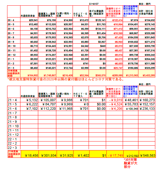 21年6月の日銀資金供給とマネタリーベースは以下の通り。参考までに昨年度の数字も載せたが今年度は今のところ多くない。この供給した資金のうち金融機関が貸出切れずに余った資金が下のグラフの黄色と緑の部分であるから、それほど”大規模に緩和”しなくても、金融機関が日銀に持っている口座には資金が余り切っている。そちらを貸出してくれるように指導するべきとは思うのだが、自民党政権に総裁に就けてもらった黒田氏としては”大規模緩和やっています”というリップサービスはしておきたい、というところだろう。ところでツイッターは日本に進出してすぐに始めたが、どうもK国人やC国人を中心に良からぬ陰謀がありそうな気がして批判的なコメントをしていたら5回も”攻撃的なアカウント”だとして凍結をくらって頭にきて止めたが(ほとんどはK国人の出鱈目なツイートに対する反論)、暇つぶしに始めたインスタでは花の写真とか猫とかその日の食事とか、当たり障りの無い写真をアップし、主婦の人とかと主にこれおいしかったよ的な話をしてたのだが、突然に凍結をくらった。やはり理由は”攻撃的なアカウント”だからなんだそうで。恐らくツイッターもフェイスブックも中国共産党のシンパであって、SNSの言論を統制することで日本社会を支配しようと目論んでいるのに違いない!と喝破した。”凍結するのに理由はいらない。利用者がザッカーバーグとやらの気に障れば利用を停止してしまうのだ”反論すら許されずに!その後インスタから”凍結を解除したから続けるように”とかいう内容のメールが来たが、随分上から目線だなとムカついたので全て迷惑メールにぶっこんでやった。米国のSNS企業は全て全体主義者の言論統制に協力している違憲企業である!と。(#ーー)