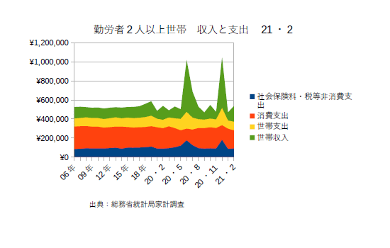 家計調査21・2の結果は以下の通り収入に対して支出が抑えられており、その分貯金・株式・FXなどへ資金が流れていることが想像される。(^・・)ノ
