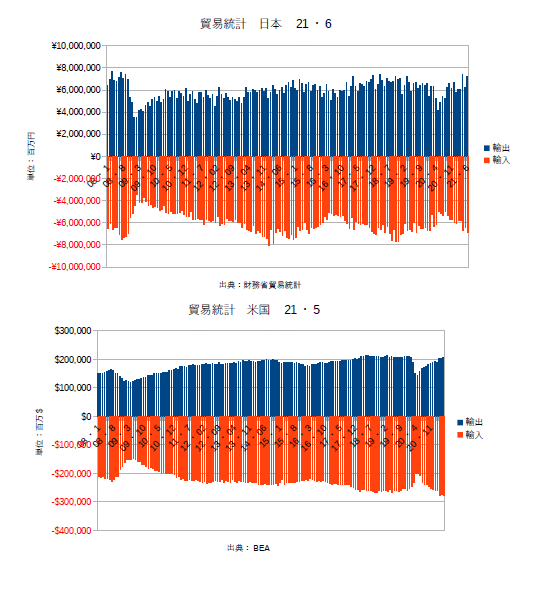 しばらく掲載していなかったが、日本と米国の貿易統計である。コロナ問題を中心に特定の業種・企業は余り芳しくなく、マスコミは総じてマイナスのニュースを伝えがちだが、マクロでは世界の景気は2021年から太陽の活動が活発になりつつあると共に上昇しており、例えば飲食・旅行・空運などの惨状が伝えられていてもそれらはミクロ経済の問題であると思うべきだろう。ただ、ワクチンの効果は100%ではなく、人々は太陽の活動が高まるとウキウキして行動意欲も高まるので、感染対策は更に練るべきだろう。(‘・ω・‘)