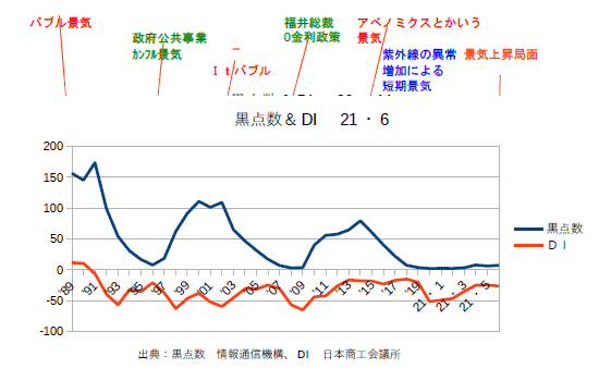 9月の黒点数とDI(景気動向)は以下のとおり。太陽の活動は上がっているが、DIは下がっている。基本線として個人消費が抑えられているのだ。だからこそこのところの感染者数の急減が達成しえたと思われる。無論ワクチンの効果もあるが、繁華街に出かけても必要なモノ以外買わない、ブラブラ無駄に歩き回らない、という消費者の動きが大きいのではないか?ということが伺われる。政府や”専門家”はワクチンの効果を喧伝して、規制を緩めても大丈夫と言いたいのだろうが、実際には国民一人一人が無駄な動きをしなくなった事が主因と見られる。飲み薬の治療薬を一刻も早く世に出すこと。景気を復活させるにはそれしかあるまい。(^・ω・^)
